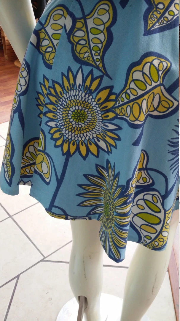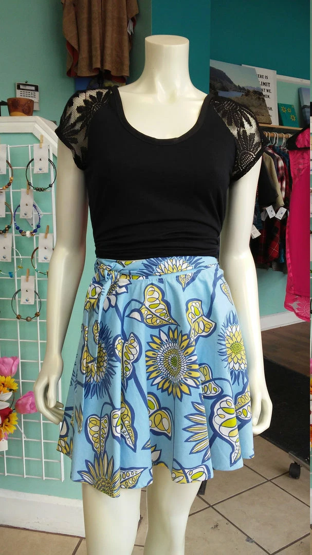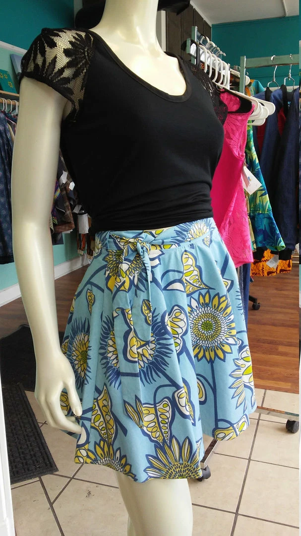 Flirty wrap skirt, in a medium bodied canvas. A-line cut is ultra feminine and flattering, with wrap and side tie waist. Canvas in a blue floral print. Mid thigh length, an easy look for quick styling!