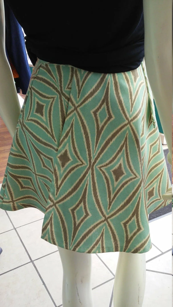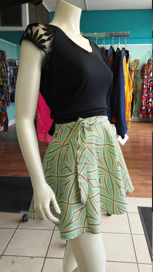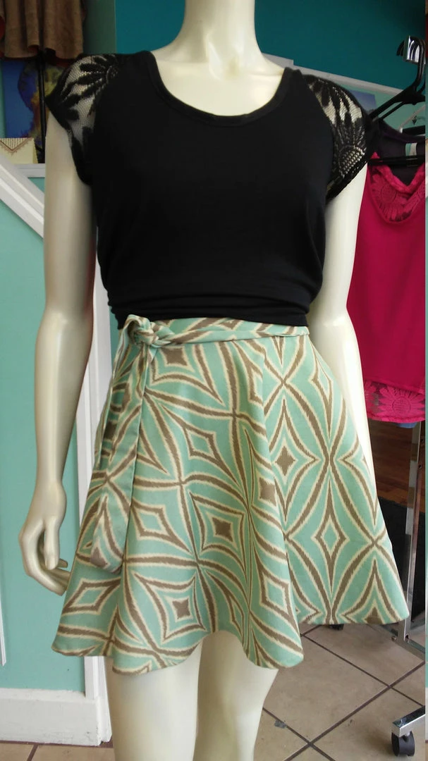 Flirty wrap skirt, in a medium bodied canvas. A-line cut is ultra feminine and flattering, with wrap and side tie waist. Canvas in a turquoise and gray print. Mid thigh length, an easy look for quick styling!