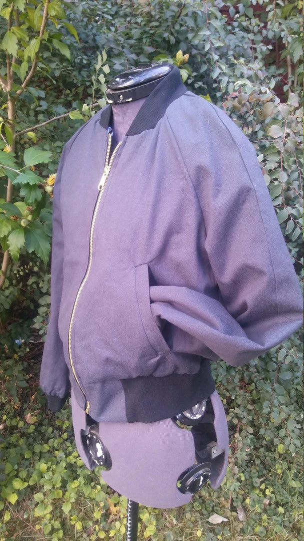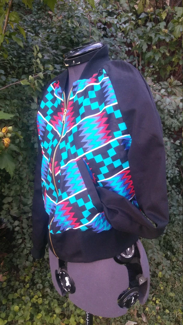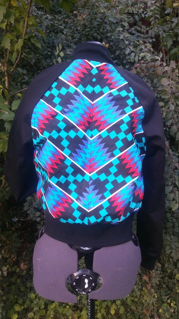 New reversible bomber, in a wax block African Kente print and Moda denim. Welt pockets both in and out. Unisex sizing. The bold turquoise, red and black wax cotton is direct sources in West Africa. Denim side neck stamped with “Sankofa.” Sankofa is a word in the Twi language of Ghana that translates as “Go back and get it” symbolized by a bird with its head turned backwards carrying a precious egg in its mouth. Sankofa is often associated with the proverb, “Se wo were fi na wosankofa a yenkyi,” which translates as: “It is not wrong to go back for that which you have forgotten.” All clothing handmade in Cleveland, OH