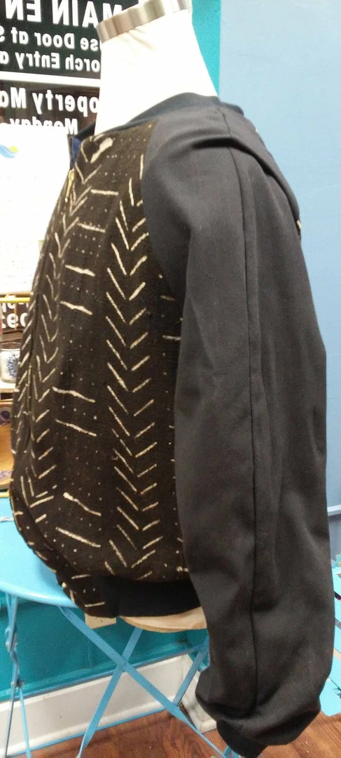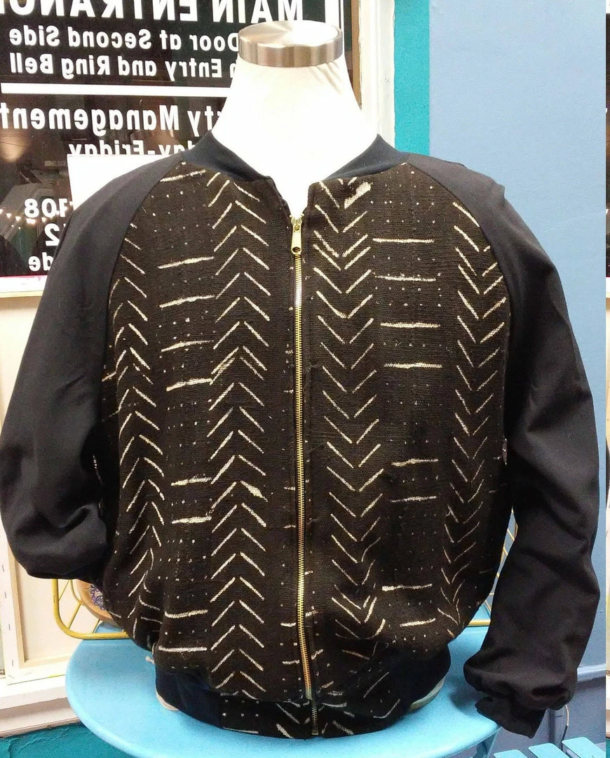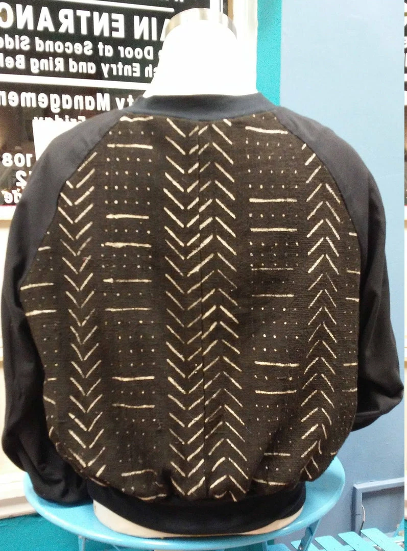 Mud cloth bomber is handmade in my Ohio City studio. Please contact me for custom sizing.