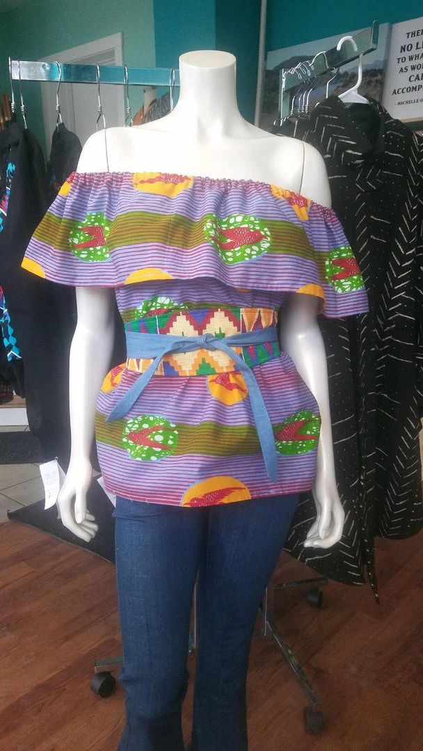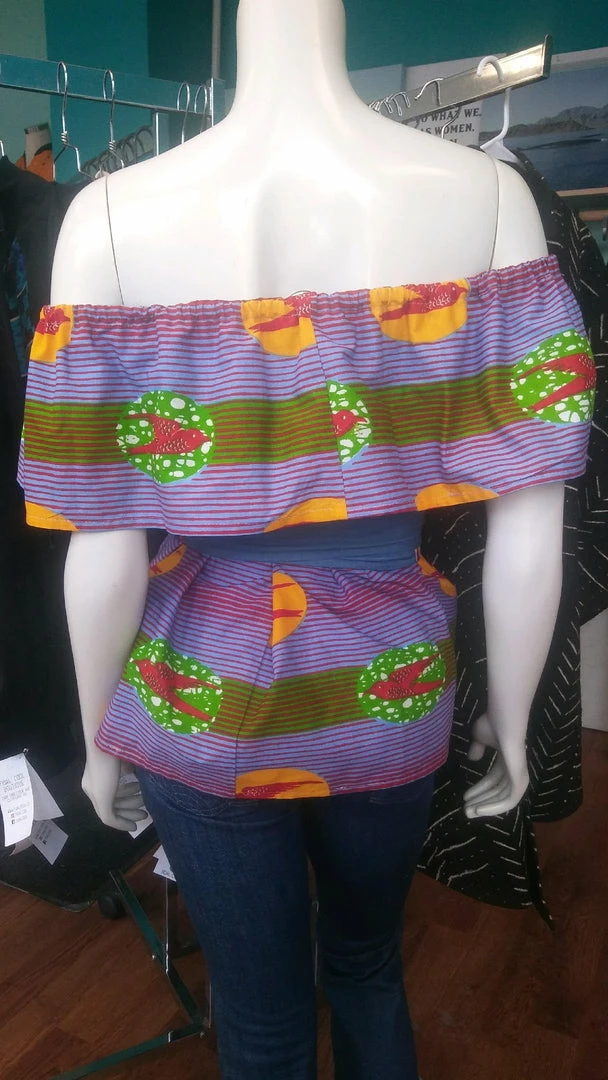 Beautiful off the shoulder Ankara flounce top featuring a single flounce layer with an elasticized off-the-shoulder neckline. Made with purple wax block cotton in bird motif, from GTP fabrics (Ghana). Shown with Tidal Cool Obi belt, belt sold separately.