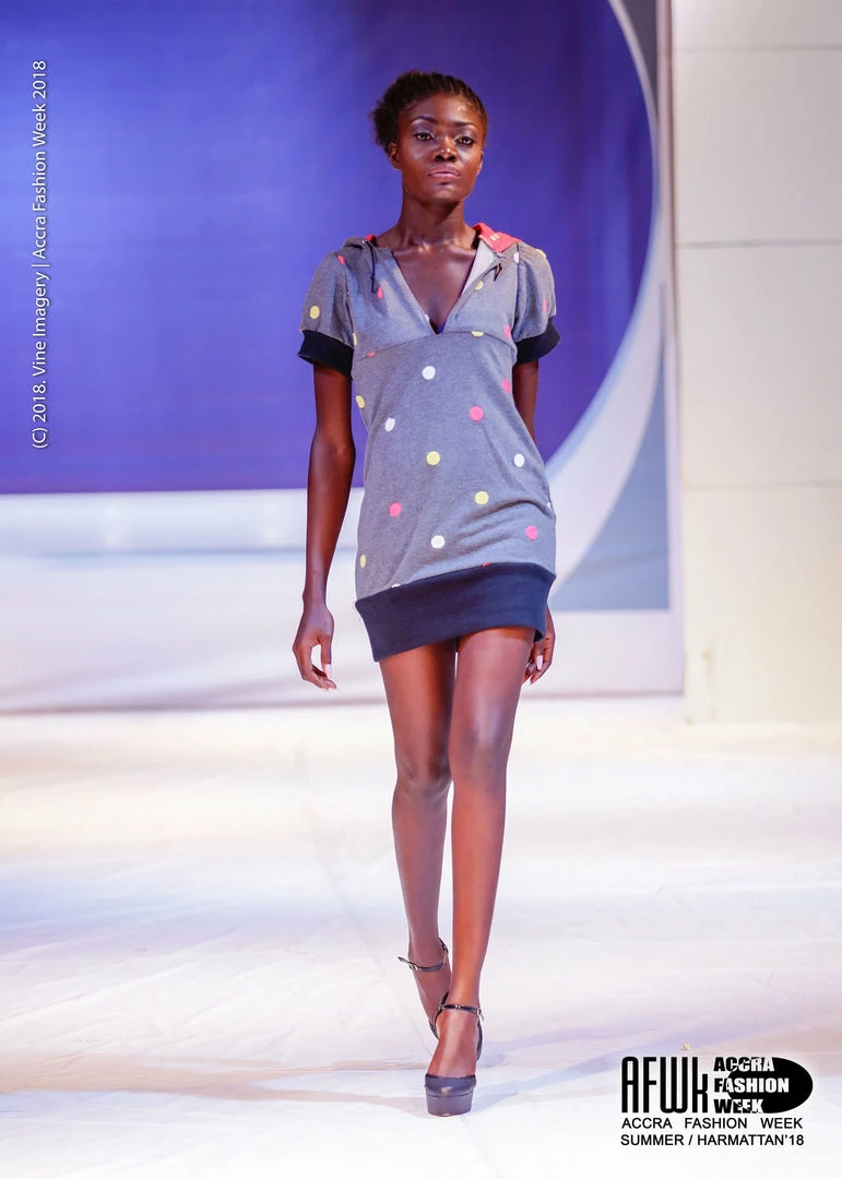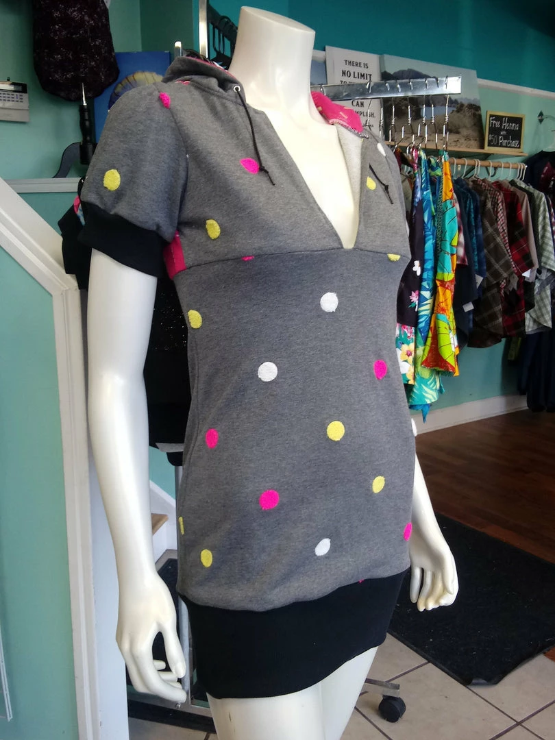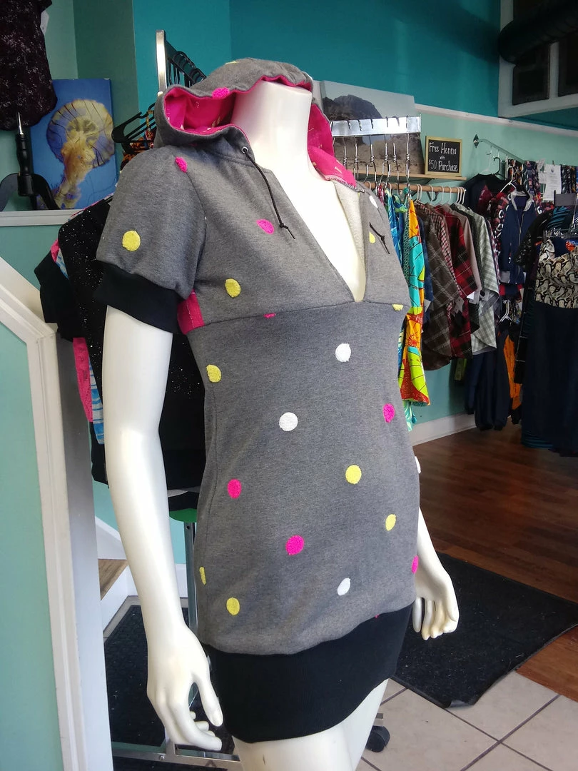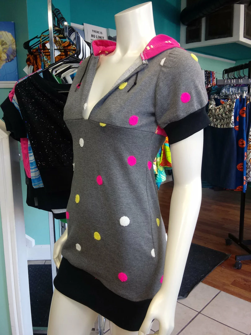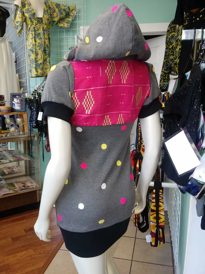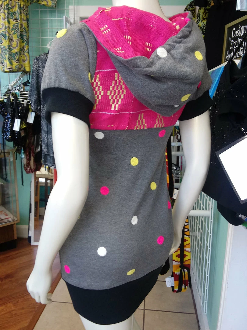 Flirty athletic streetwear dress, made from grey sweatshirt knit with embroidered neon polka dots, and contrast hot pink Kente cloth hoodie and yoke. Kente is a handmade, handwoven textile, sourced directly from weavers in the Kumasi Region of Ghana. Rib knit finish on sleeves and hem. Part of the Tidal Cool Lagoon 2019 Collection for Accra Fashion Week, Ghana. Machine wash gentle, lay flat to dry.