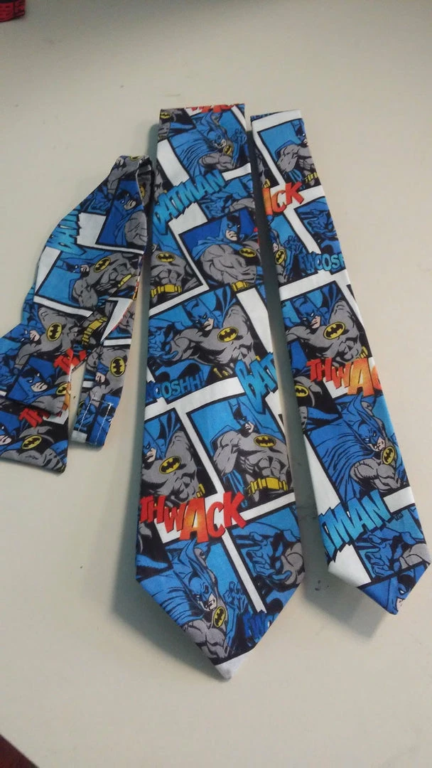 Batman Comic Necktie in bow tie, skinny tie, or standard tie styles, and kids or adult sizes. Adult Batman bow tie is self-tie, sized to 16.5″, custom length available at no charge. Kids’ bow tie comes pre-tied, and has back elastic to allow it to slip over the head. Please see chart below for full necktie and bow tie sizing for children and adults.