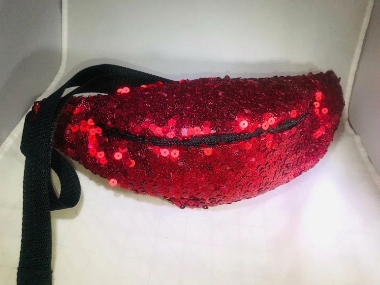 Red sequin color shift hip bag, with adjustable parachute belt buckle. Fully lined in black.