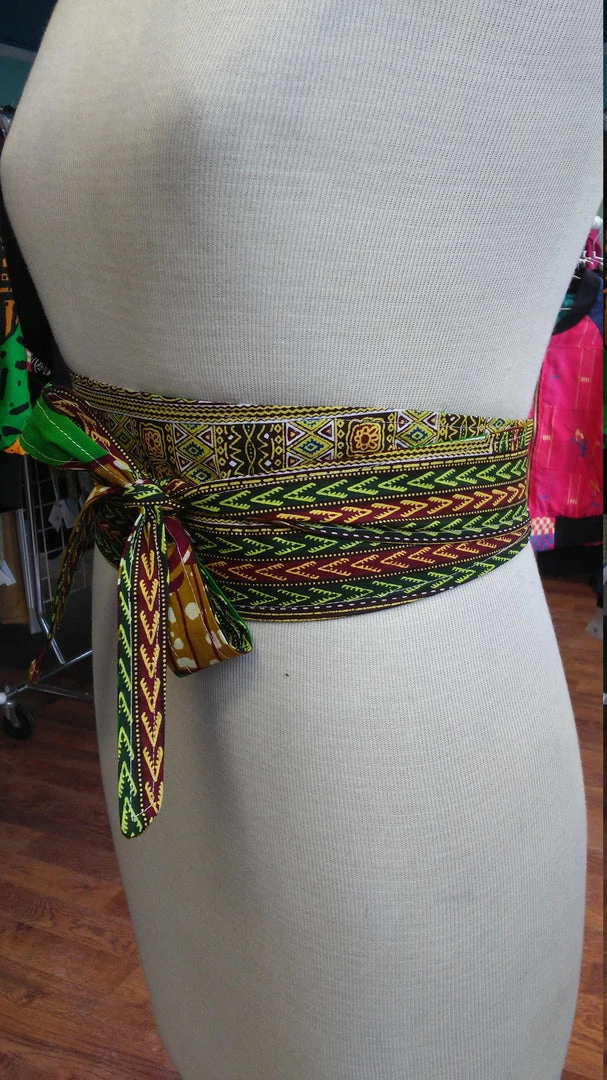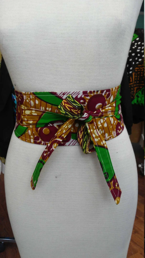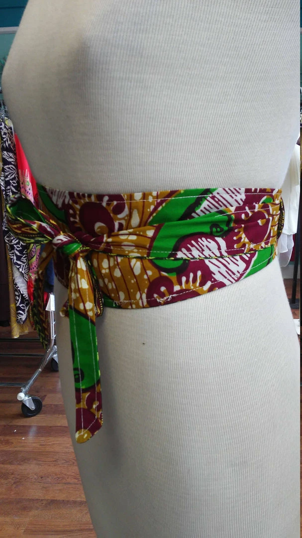 These stylish Obi belts are a perfect addition to your favorite dress, tunic, or long cardigan. It is handmade with a bright wax block fabric from Africa. These belts are 100% reversible and are made with a slip hole to slide the tie straight through for a more sleek fit. Worn around the waist, accentuate your curves and cinch your waist with one side, then flip it over to show off another unique pattern. All clothing is handmade in Cleveland, Ohio