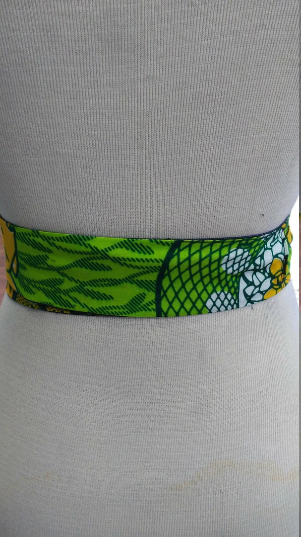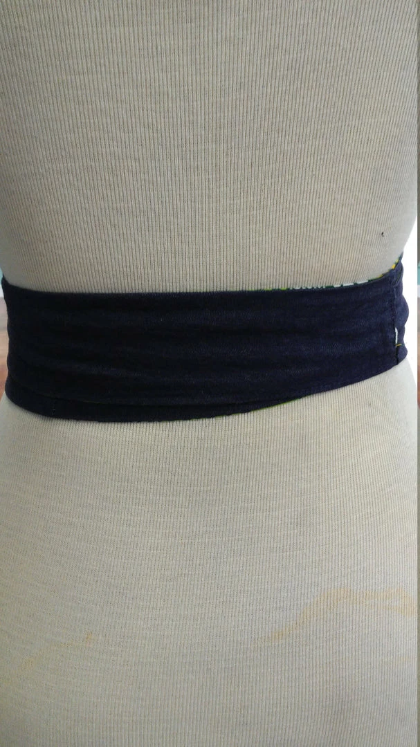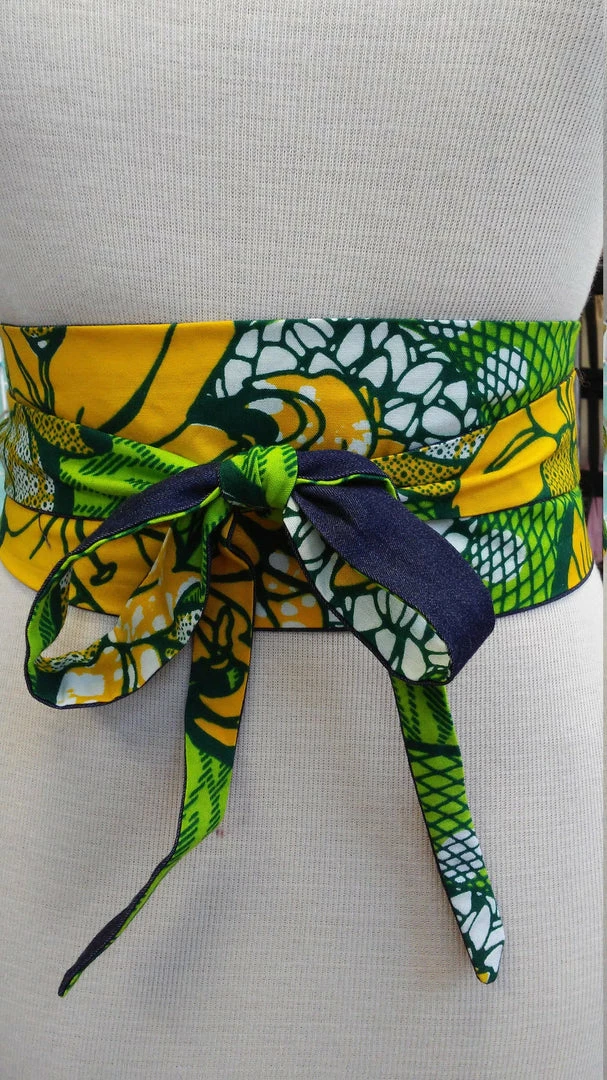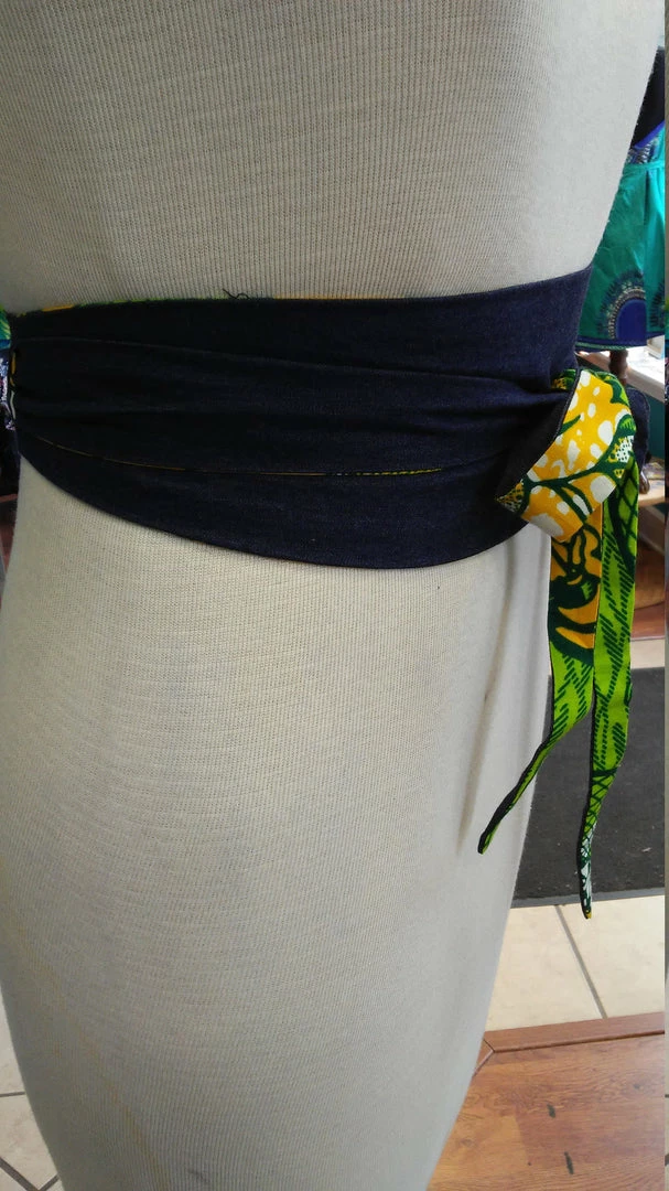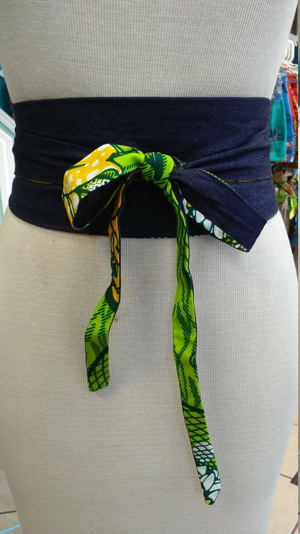 This stylish Ankara Obi belt is a perfect addition to your favorite dress, tunic, or long cardigan. It is handmade with a vibrant green and yellow wax block cotton fabric from Ghana, Africa. This belt is 100% reversible and is made with a slip hole to slide the tie straight through for a more sleek fit. Worn around the waist, accentuate your curves and cinch your waist with one side, then flip it over to dark denim blue. All clothing is handmade in Cleveland, Ohio.