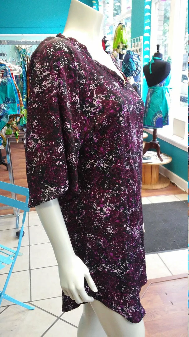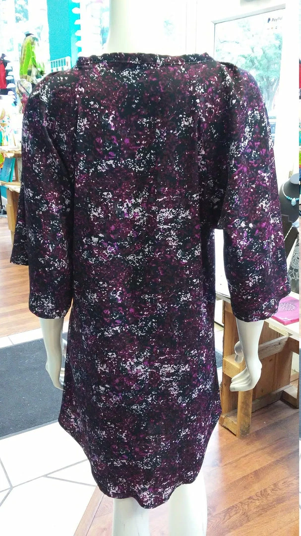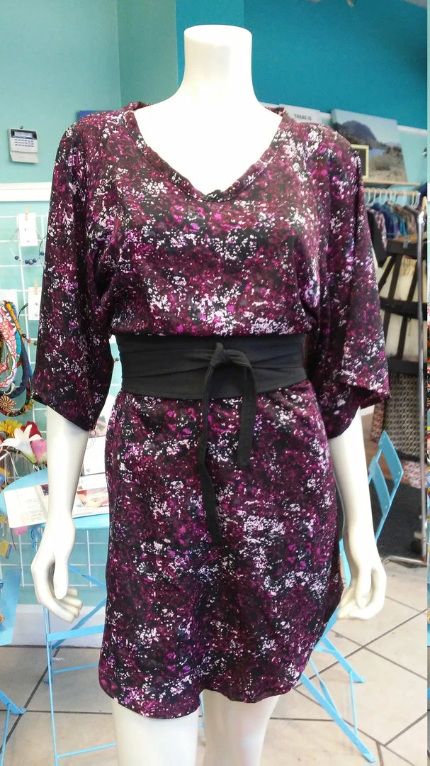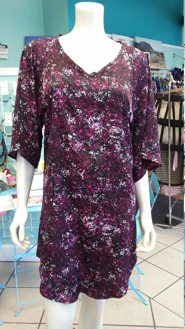 Flutter sleeve tunic dress, with raglan sleeve, bias neckline, and shirttail hem. Made from royal purple splatter fabric. Easy care, machine wash cold. Shown with Tidal Cool Obi belt, sold separately. Wear as a stand alone dress, or pair with leggings to extend the season