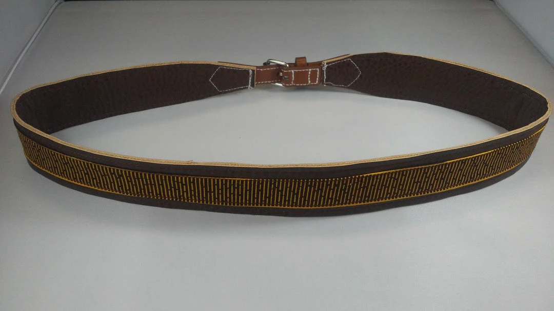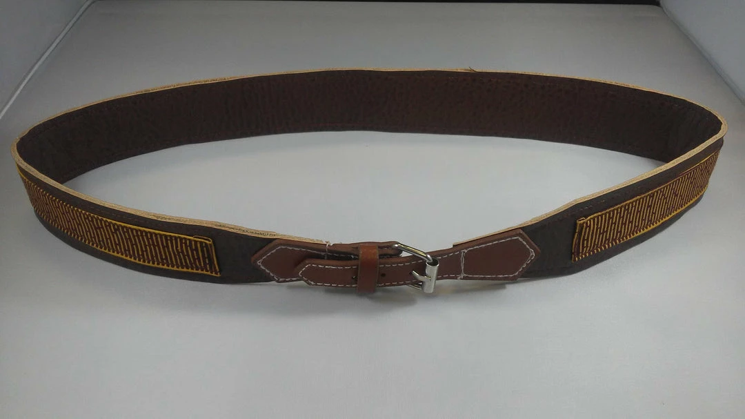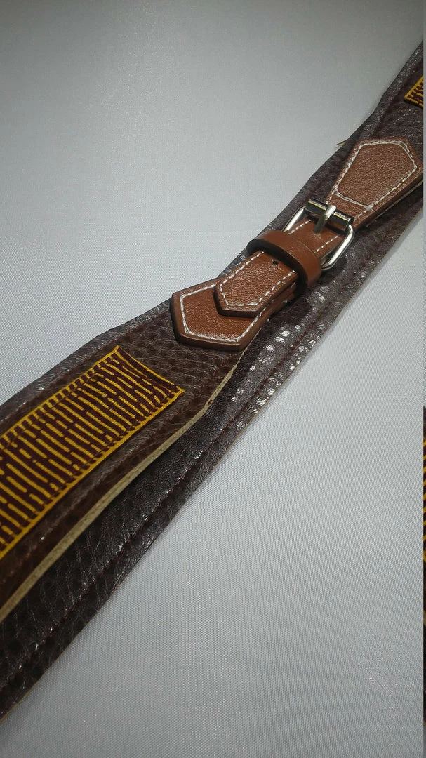 Vegan leather and African Ankara, with metal buckle closure. 30” in length before buckling. A stylish way to compliment and accent your look.