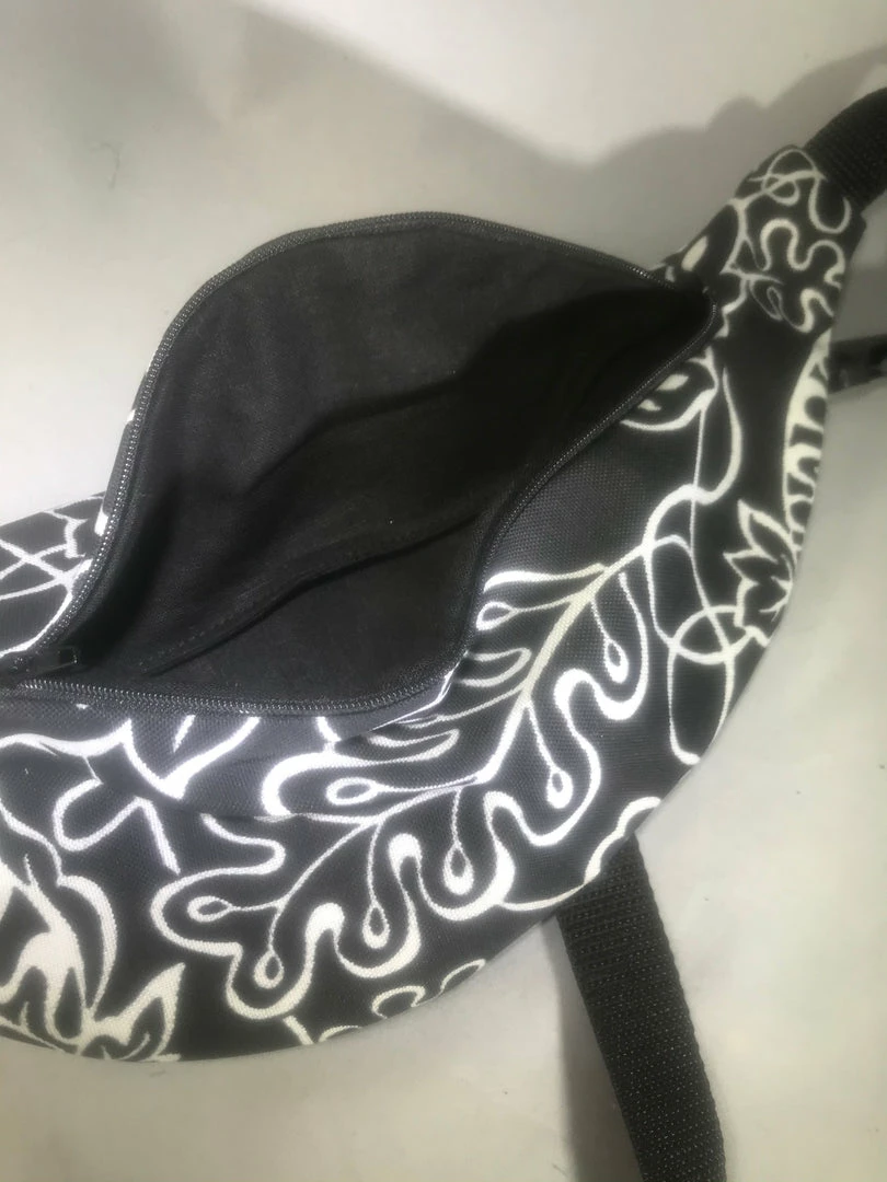 Black and white graphic print hip bag with adjustable parachute belt buckle. This fanny pack is made from water resistant canvas, and fully lined.