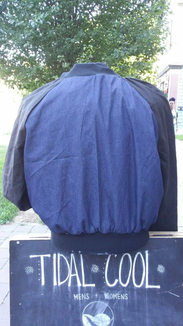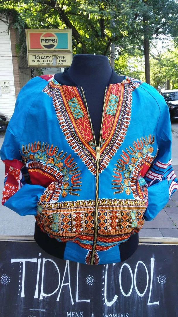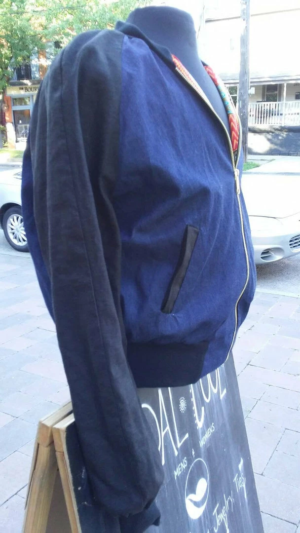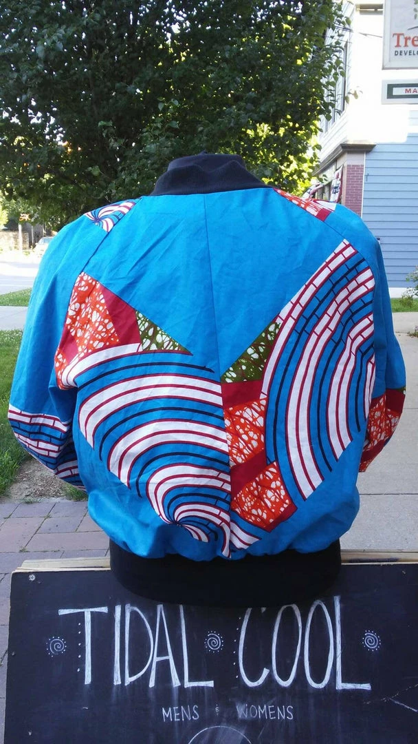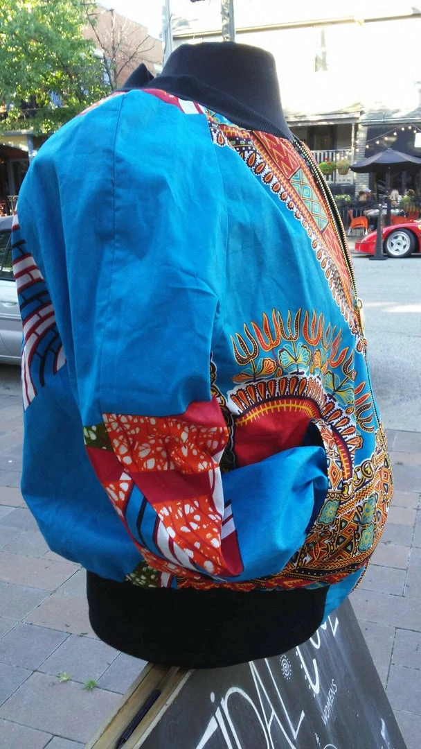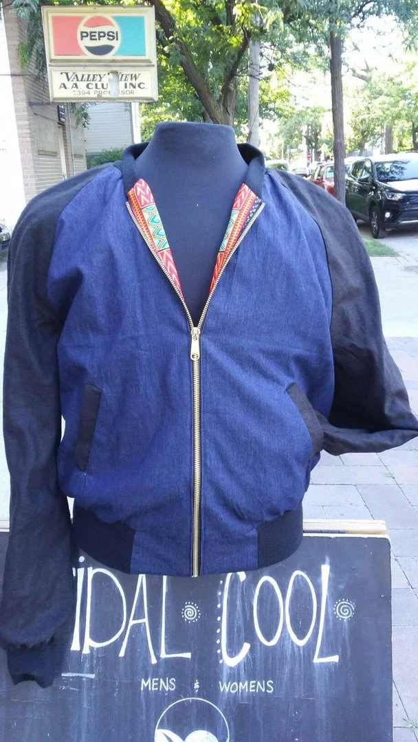 Reversible Ankara bomber jacket. Bold blue and red dashiki wax block African cotton, reverses to denim and black chambray. Unisex sizes with welt pockets on both sides. Unisex sizing (order one size smaller for women). Heavy duty zipper closure.