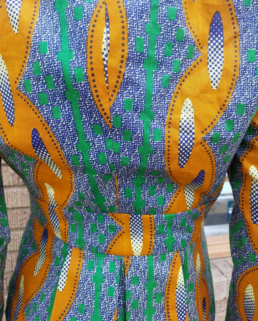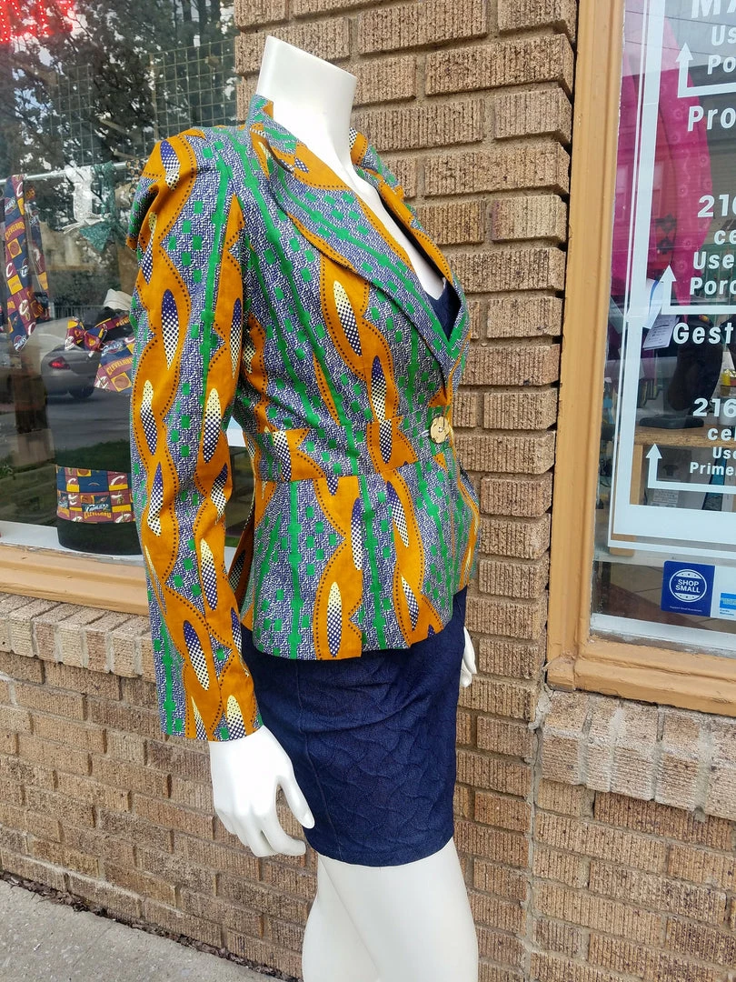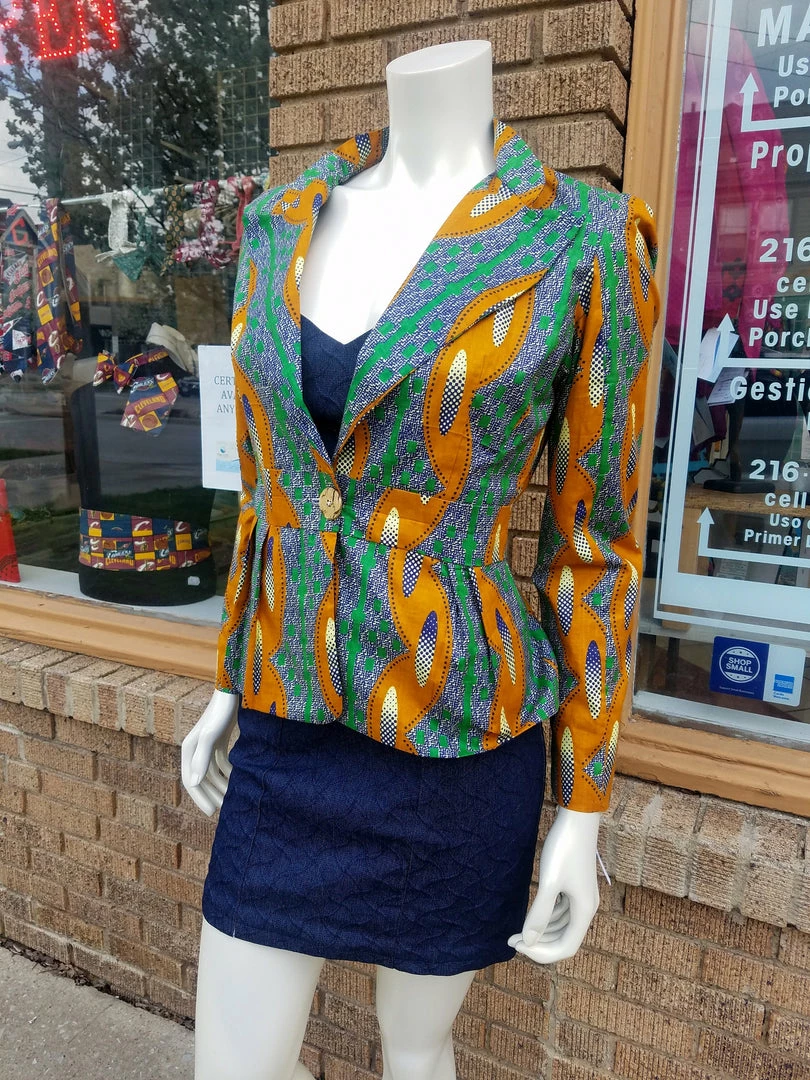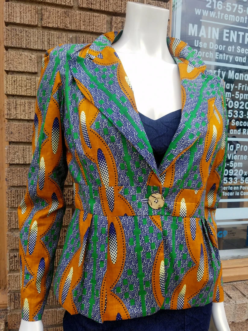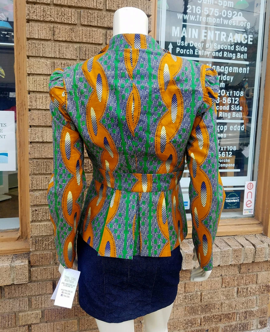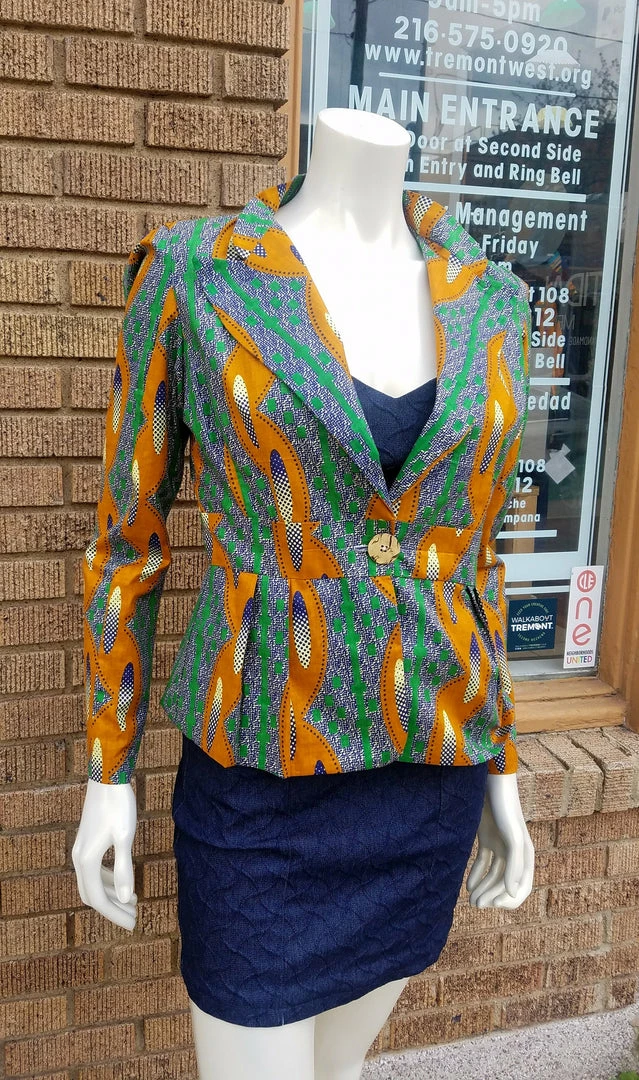 Fitted blazer in a beautiful African wax black cotton. Blazer features a fitted silhouette, pan collar with turned lapels, and front coconut button closure. The blazer is made from a high quality wax block cotton, made in Africa by Akosombo Textile Limited brand in Ghana. ATL is a designed and owned in Ghana, and fabric is directly sourced. Fully lined. Stylish, modern and classic, with TIdal Cool’s timeless flair. Part of the Tidal Cool Vivid! Collection, designed for Accra Fashion Week 2018. Worn with suede red body con dress, available separately.