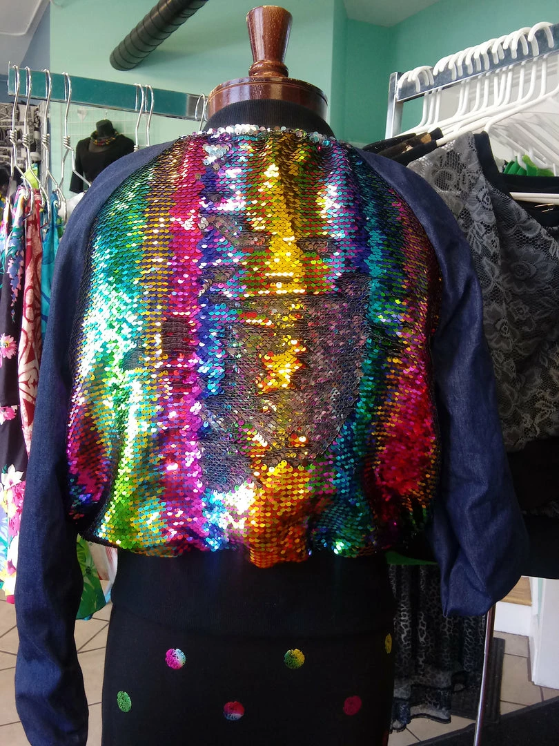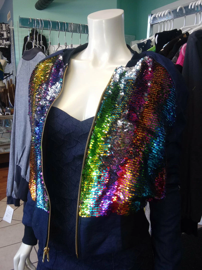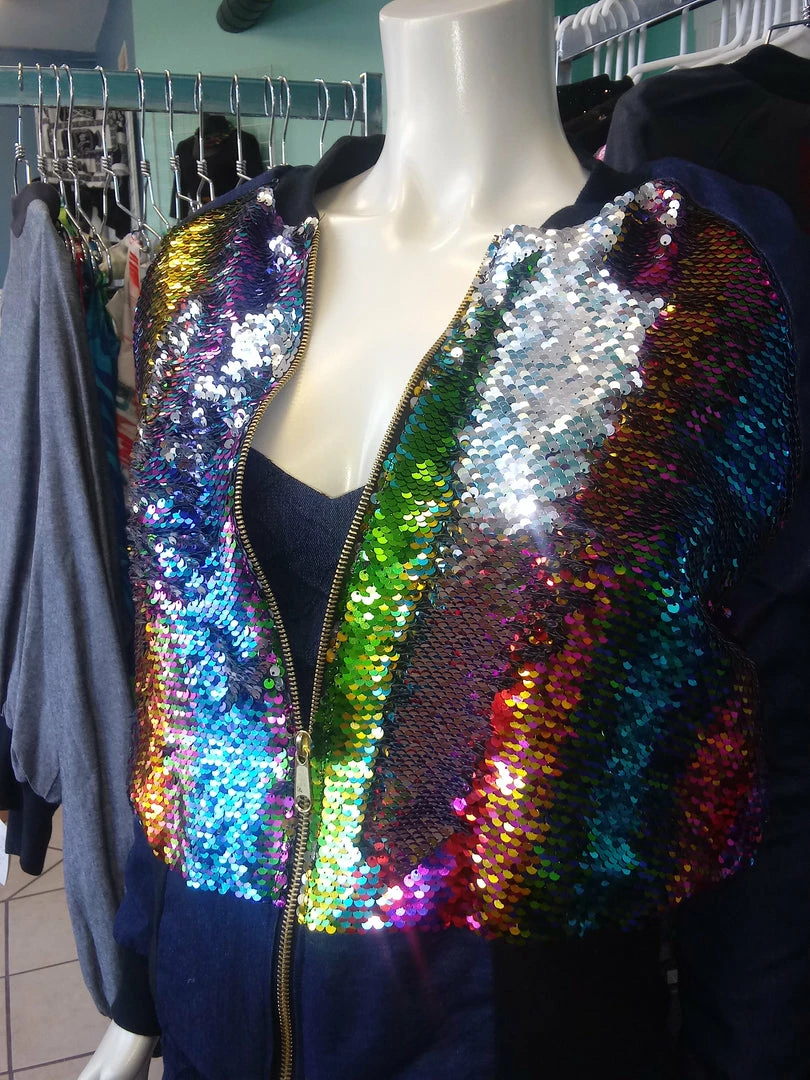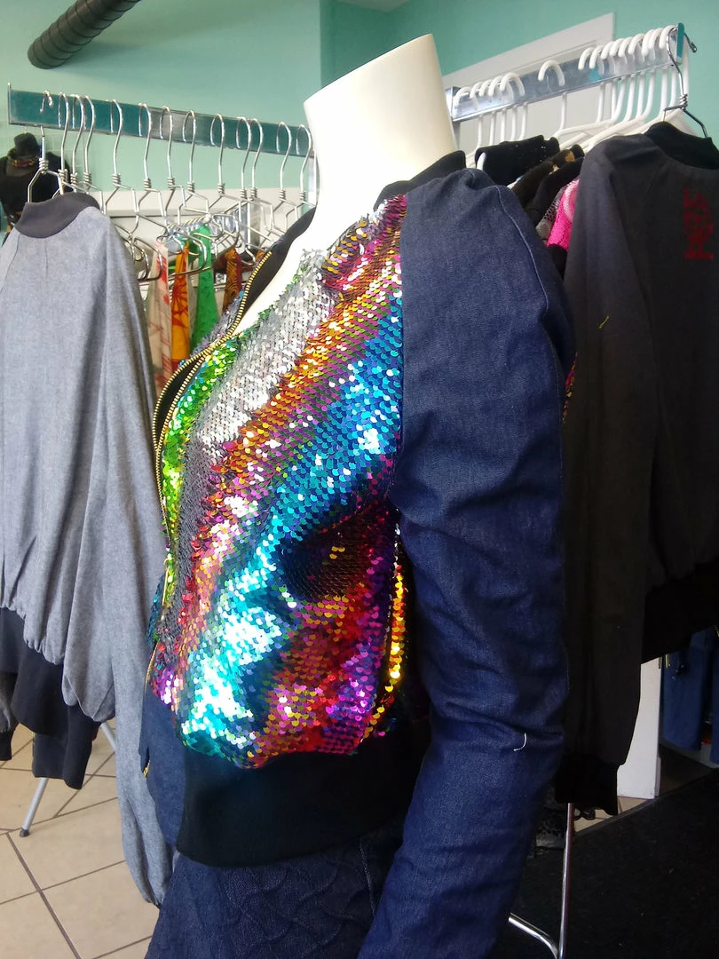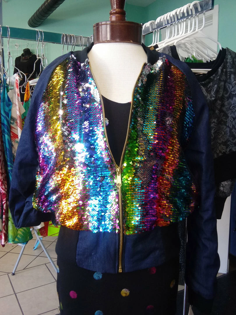 All the brightness of the rainbow and all the style of a bomber jacket. The rainbow sequin fabric flips to silver when you brush your hands against it, This sequin bomber is fully lined, and has side pockets. Finished with black ribbing at neck, waist and wrists. This is sized for women, but the jacket is unisex, please order one size up for men. I also have a listing for this fabric in a pullover shirt and a hip bag. All clothing handmade by Tidal Cool in Cleveland, OH and available for local pickup.