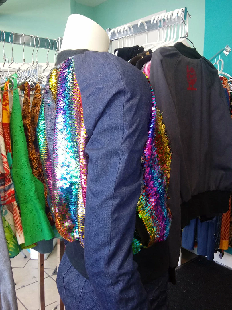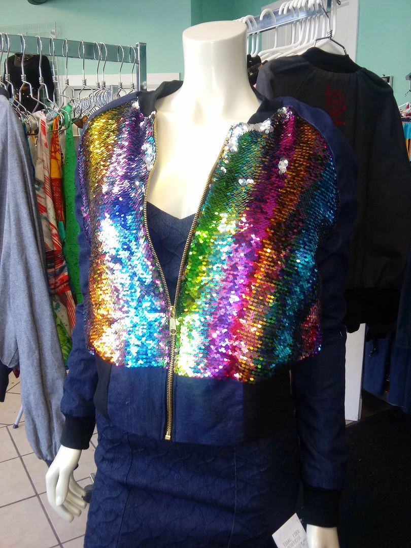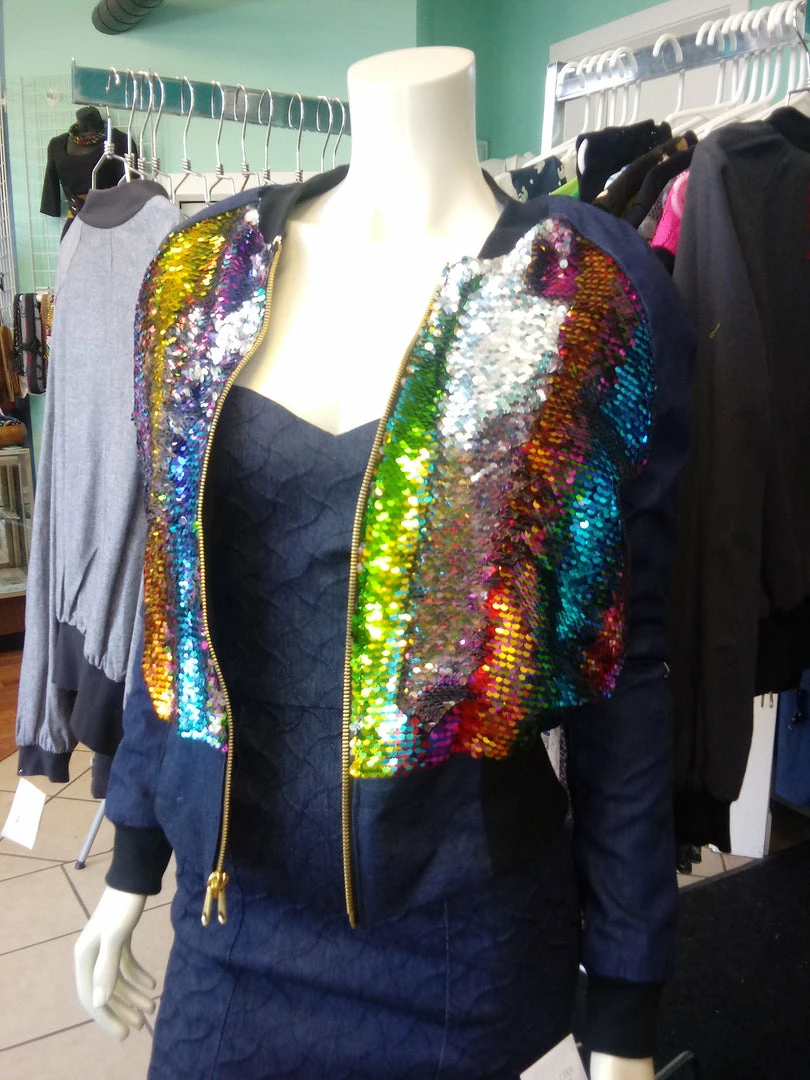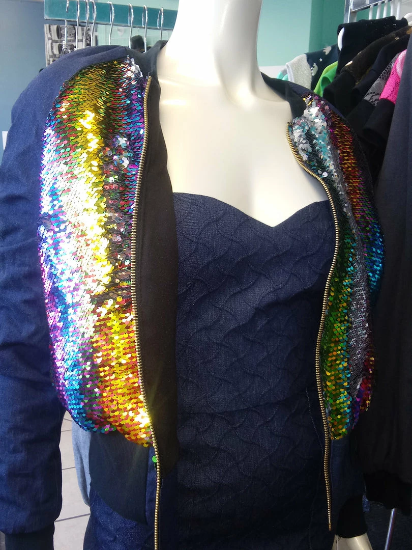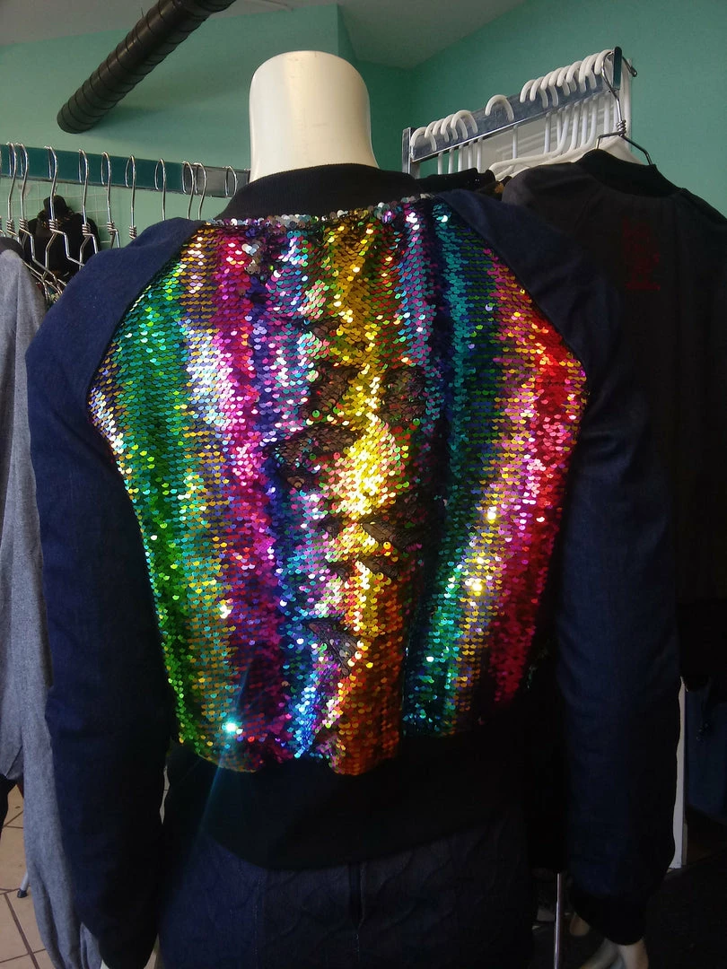 All the brightness of the rainbow and all the style of a bomber jacket. The rainbow sequin fabric flips to silver when you brush your hands against it, This sequin bomber is fully lined, and has side pockets. Finished with black ribbing at neck, waist and wrists. This is sized for women, but the jacket is unisex, please order one size up for men. I also have a listing for this fabric in a pullover shirt and a hip bag. All clothing handmade by Tidal Cool in Cleveland, OH and available for local pickup.