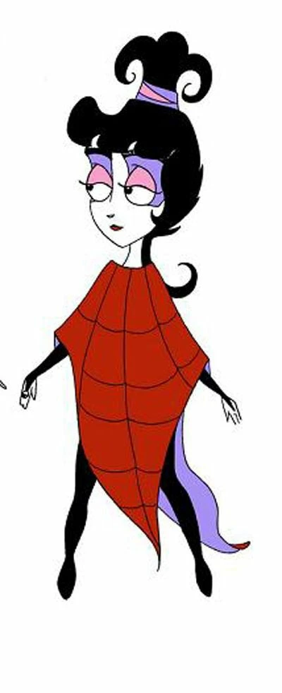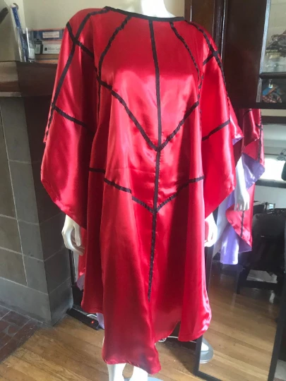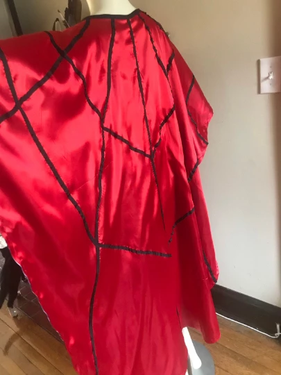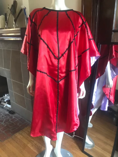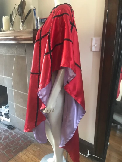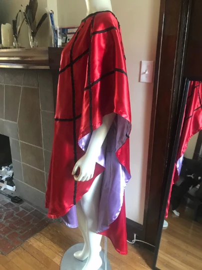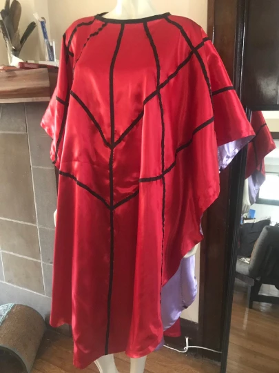 Red and purple web Lydia Deetz Cosplay tunic, from the animated Beetlejuice cartoon. Lydia Deetz tunic is poncho pullover style, with red satin outside and purple lining. Black binding is stitched in the spiderweb pattern. A fantastic Beetlejuice costume for Halloween or theme party!