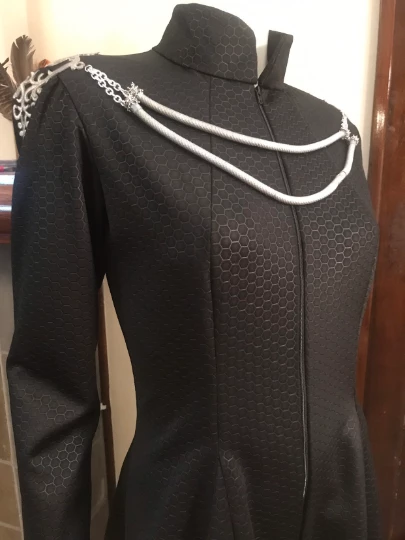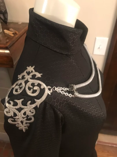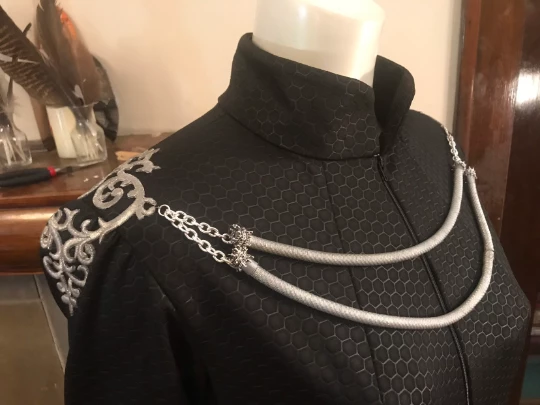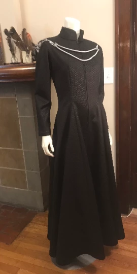 Cersei Lannister Costume/cosplay dress and shoulder armor. This listing includes the black heavy textured floor length gown, made to order using your measurements, and shoulder jewelry made from appliques and metal rope. Fabrics and materials may vary slightly.