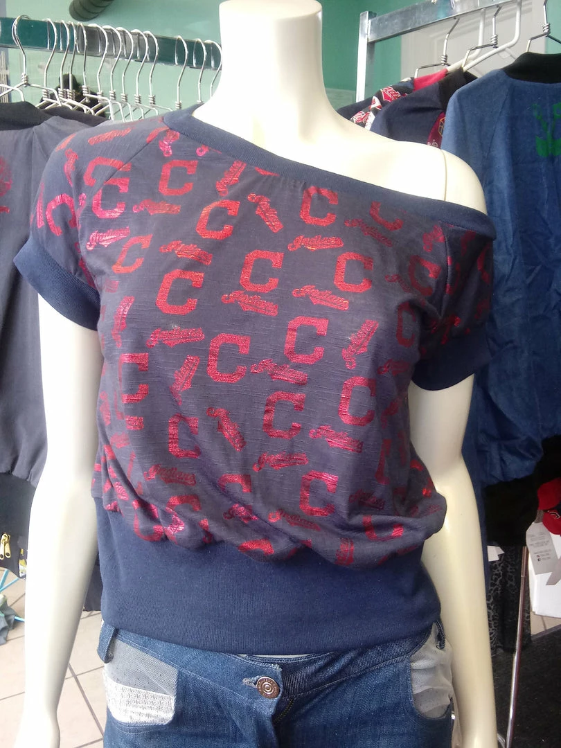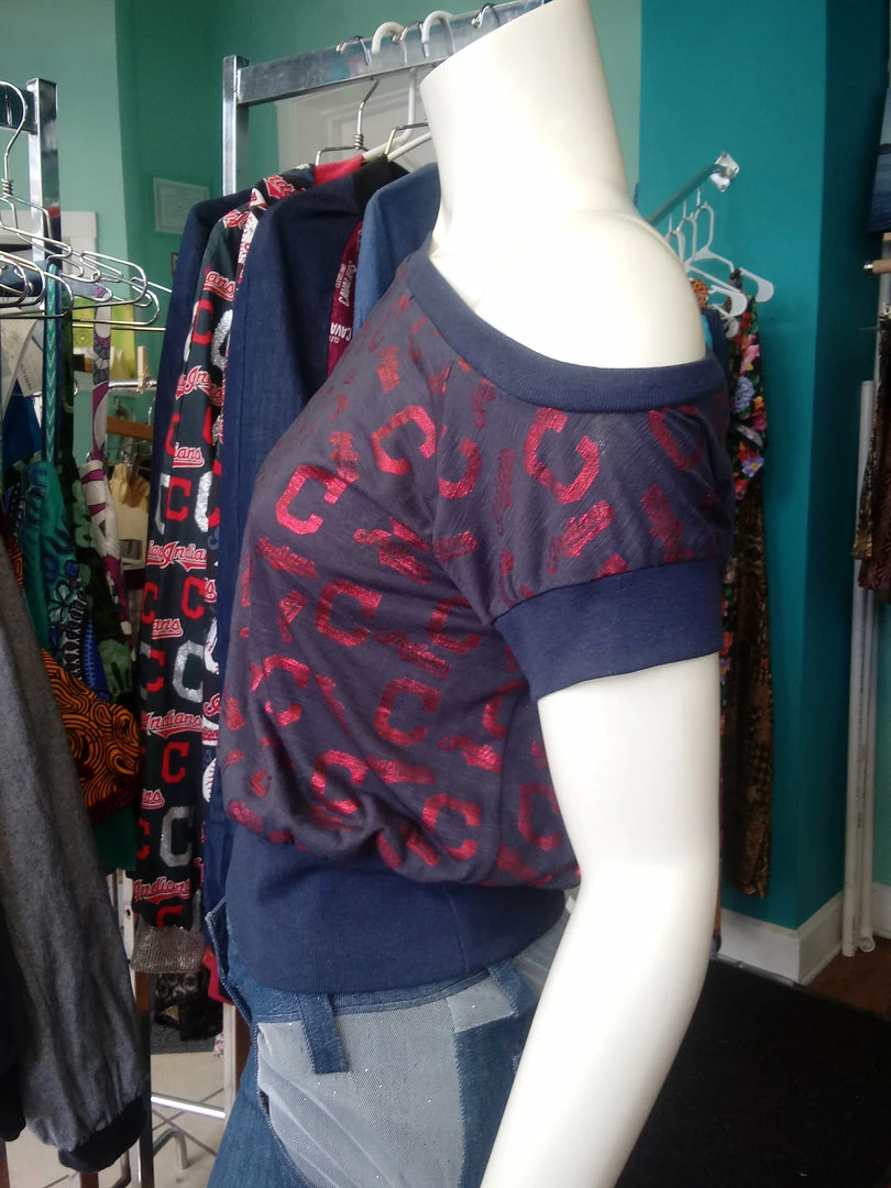 At the intersection of comfort and fashion, this flirty off shoulder top will step up your casual game. Made from Cleveland Indians navy fabric, ultra lightweight and drapey, finished with navy ribbing. Easy care, machine wash cold.
