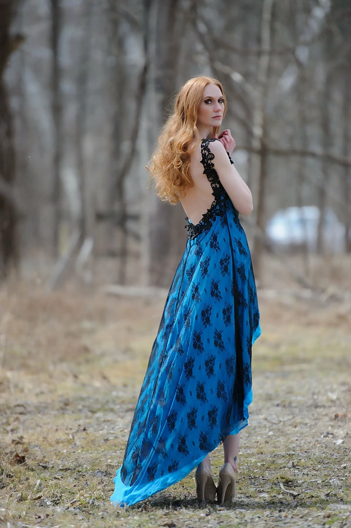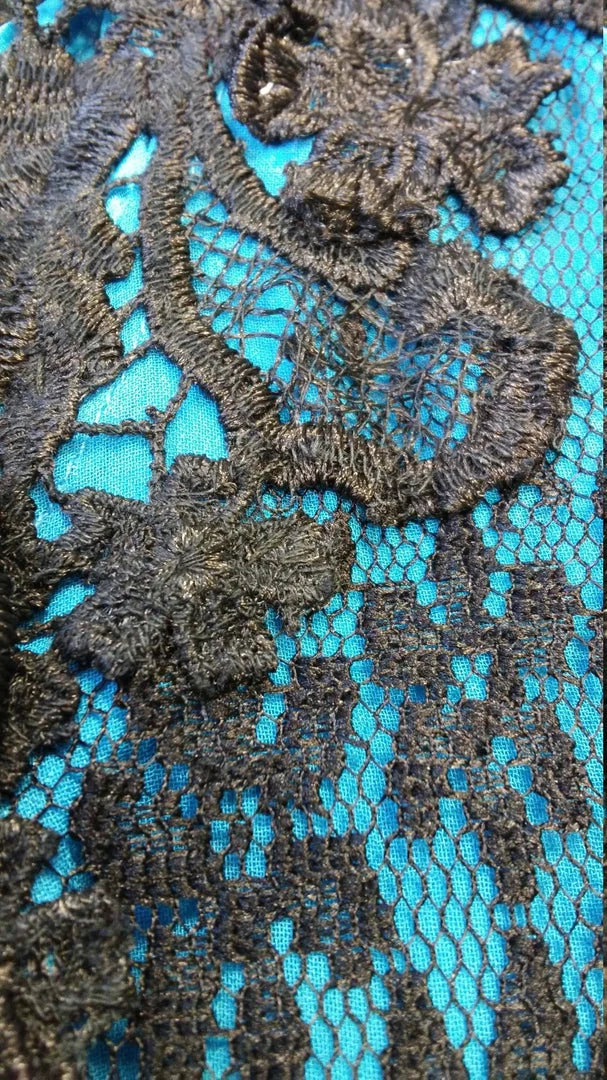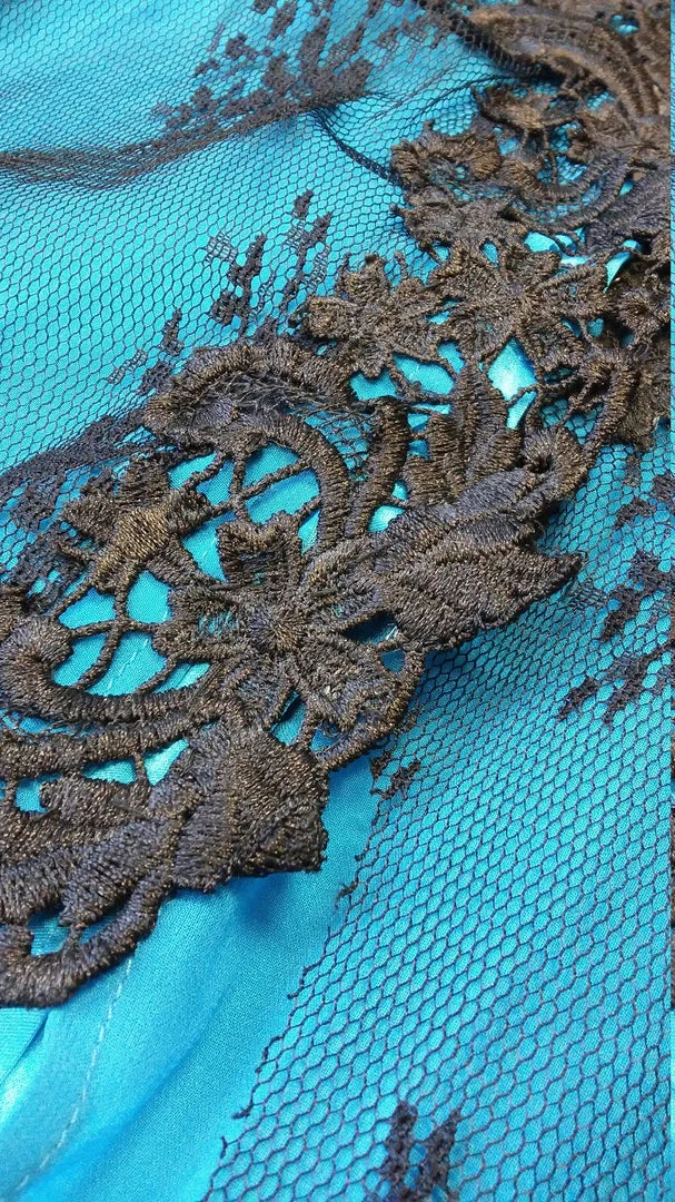 Stunning asymmetrical couture evening gown in teal silk and chiffon and black lace. The one shoulder gown has a deep plunge front, and is made with 100% silk charmeuse in horizon blue, overlaid with 100% silk chiffon in horizon blue, overlaid with black lace. The bodice and back edges are trimmed with handcut and handsewn floral lace appliques. Size 2/4