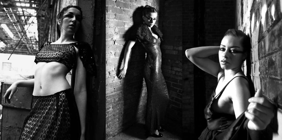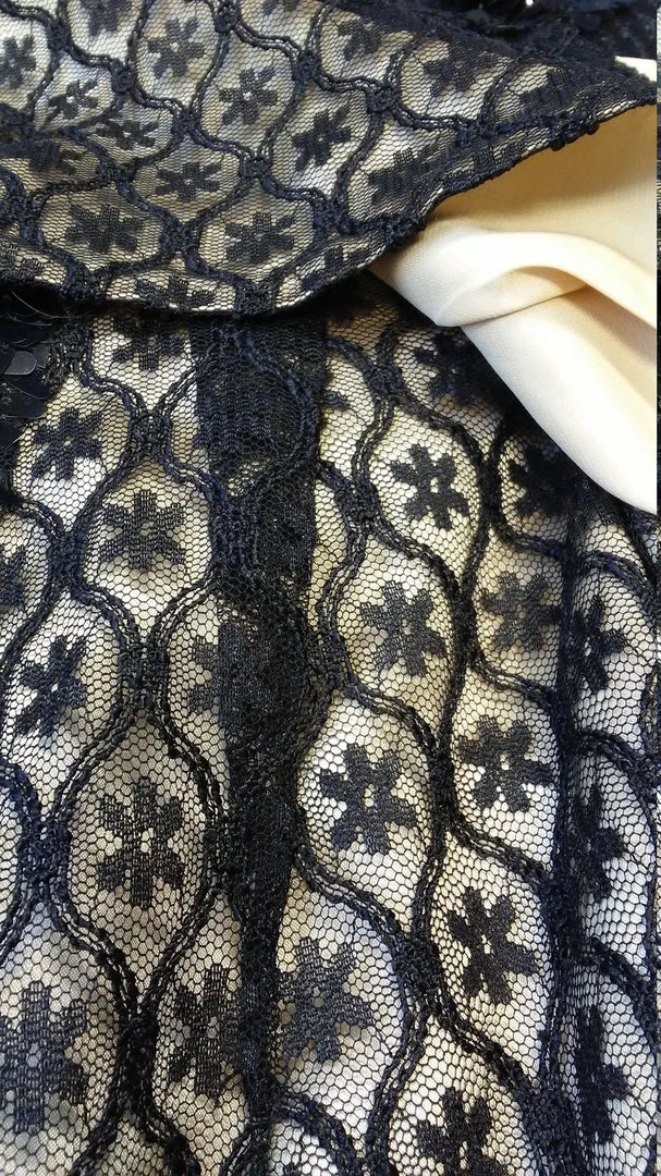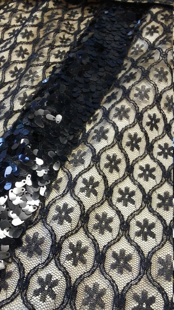 Couture evening gown with midriff top, with oval sequins, and shoulder slaps. Skirt is lined in champagne satin, covered in top quality black lace, and has side tuxedo stripes in oval sequins. One of a kind dress for a one of a kind moment. Size xs.