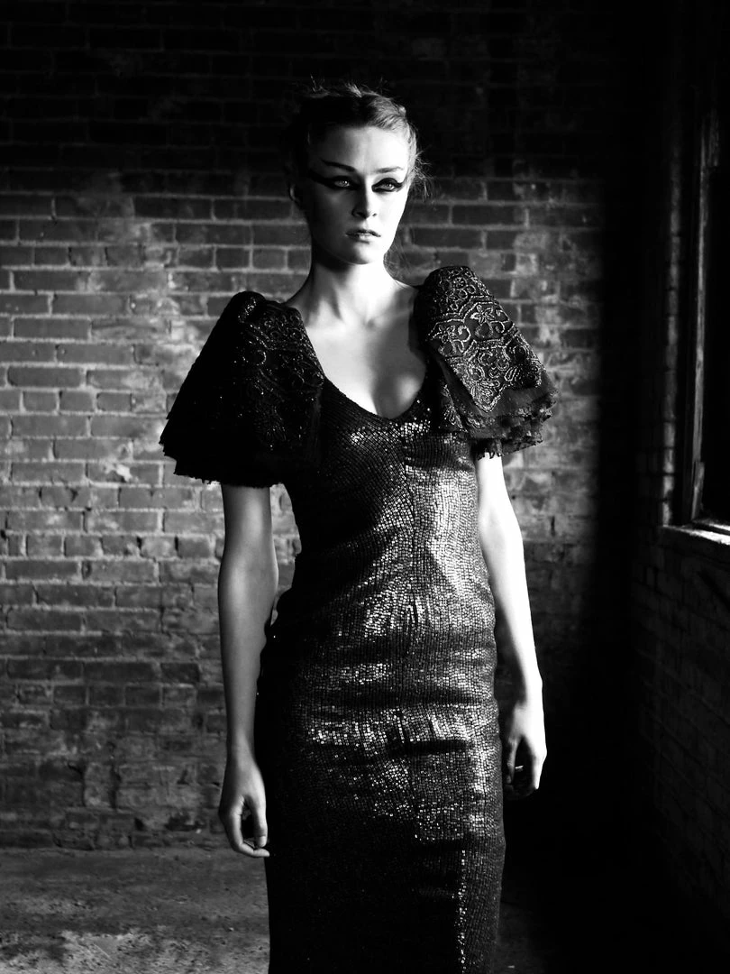 Couture gown in fitted silhouette. Slinky, dark silver square sequins, in a drapey bias, ends in a short back train. Dress is fully lined. Voluminous sleeves are made from layers and layers of lace, organza, and tulle, they will make a statement and draw all eyes to you. One of a kind, handmade couture, size 2/4