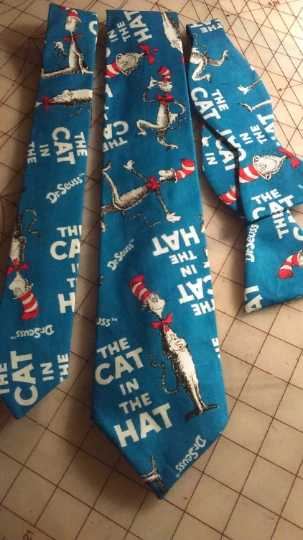 Dr Seuss Cat in the Hat necktie in bow tie, skinny tie, or standard tie styles, and kids or adult sizes. Adult Dr Seuss Cat in the Hat bow tie is self-tie, sized to 16.5″, custom length available at no charge. Kids bow tie comes pre-tied, and has back elastic to allow it to slip over the head. Please see chart below for full necktie and bow tie sizing for children and adults.