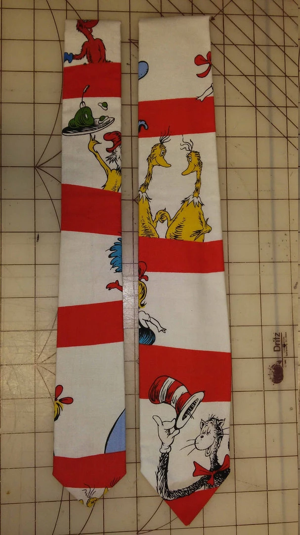 Dr. Seuss Horton and Cindy Lou Who necktie in bow tie, skinny tie, or standard tie styles, and kids or adult sizes. Adult Dr Seuss tie is self-tie, sized to 16.5″, custom length available at no charge. Kids Dr Seuss bow tie comes pre-tied, and has back elastic to allow it to slip over the head. Please see chart below for full necktie and bow tie sizing for children and adults.