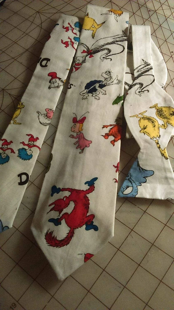 Dr Seuss necktie in bow tie, skinny tie, or standard tie styles, and kids or adult sizes. Adult Dr Seuss bow tie is self-tie, sized to 16.5″, custom length available at no charge. Kids bow tie comes pre-tied, and has back elastic to allow it to slip over the head. Please see chart below for full necktie and bow tie sizing for children and adults.