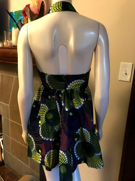 Tidal Cool Reversible Flirty Ankara Midriff Halter In African Peacock Dashiki Print