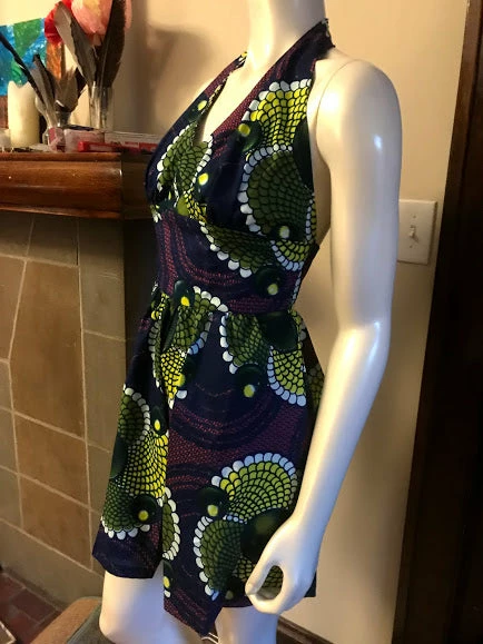 Ultra flattering and a flirty fit, this bold African print sundress is as fashionable as it is comfortable. Halter bodice ties around the neck, and has a beautiful open back, you’ll make a statement entering and exiting a room! Side pockets, back zipper. Made from bright purple, navy and lemon yellow wax block cotton. The fabric is from GTP NuStyle, a Ghanaian owned fabric company, and sourced in Accra, Ghana. Part of the Tidal Cool Lagoon Collection created for Accra Fashion Week. All clothing handmade in Cleveland, Ohio.