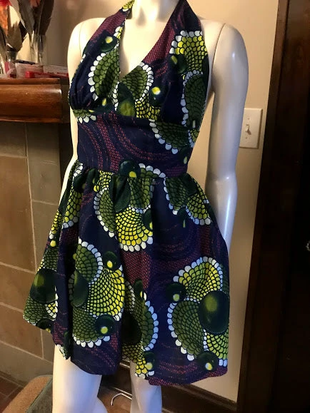 Be the first to review “Tidal Cool Dresses Flirty Halter Sundress In Purple And Yellow African Wax Block Cotton” Cancel reply