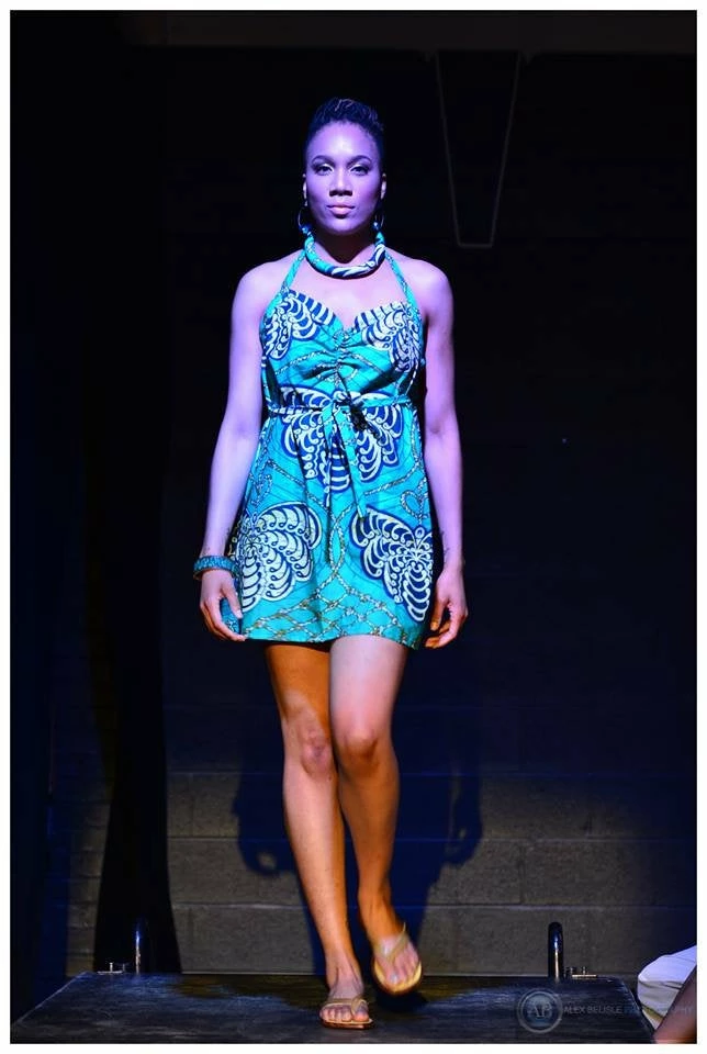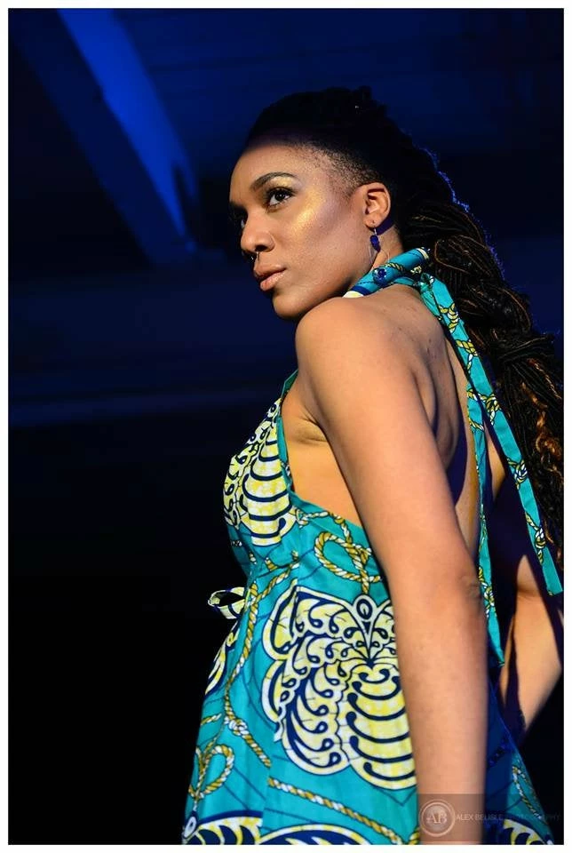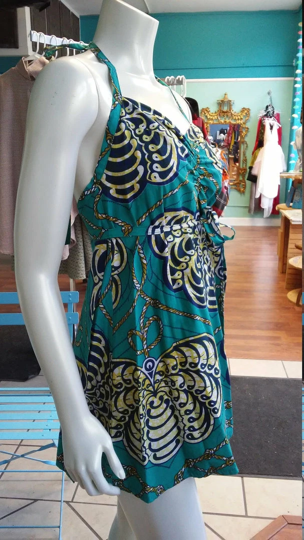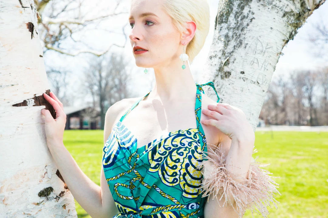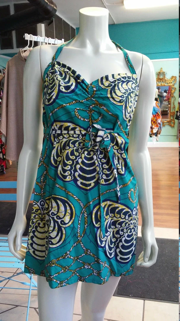 Ultra flattering and a flirty fit, this sundress is as fashionable as it is comfortable. The waist strap simply slips through a strategically places hole and wraps around to tie in the front. Halter bodice ties around the neck, and has a beautiful open back, you’ll make a statement entering and exiting a room! Made from bright wax block cotton. All clothing handmade in Cleveland, Ohio.