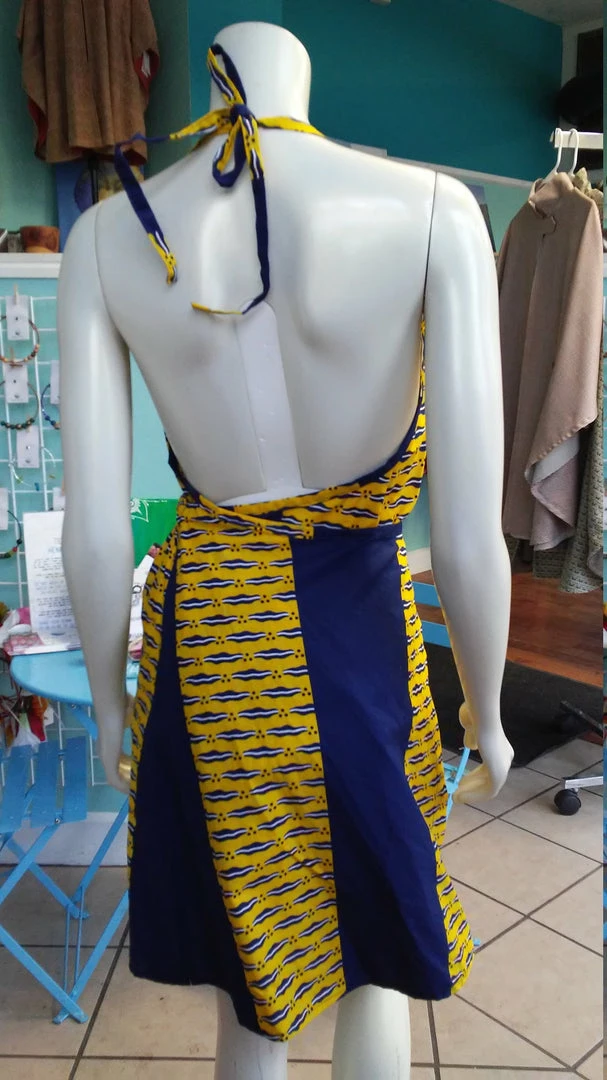 Ultra flattering and a flirty fit, this sundress is as fashionable as it is comfortable. The waist strap simply slips through a strategically places hole and wraps around to tie in the front. Halter bodice ties around the neck, and has a beautiful open back, you’ll make a statement entering and exiting a room! Made from bright wax block cotton.