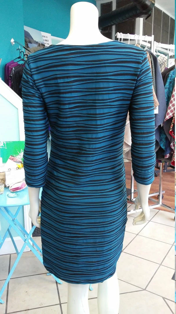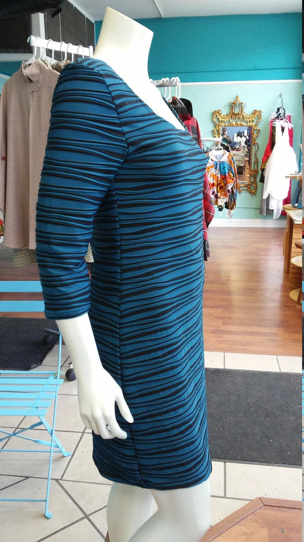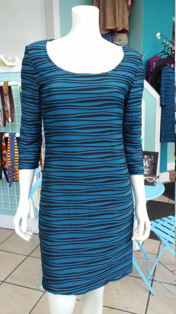 Super comfortable, lightweight three-quarter sleeve dress. Easy care, machine wash and dry. Wear with leggings, a belt, boots, etc. Versatile and comfortable.