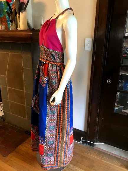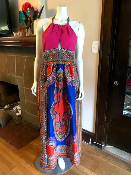 Halter maxi dress, in blue and pink dashiki print. Open back and tie neck, waist band and full skirt with side slit. Made from direct sourced African wax cotton fabric and knit.