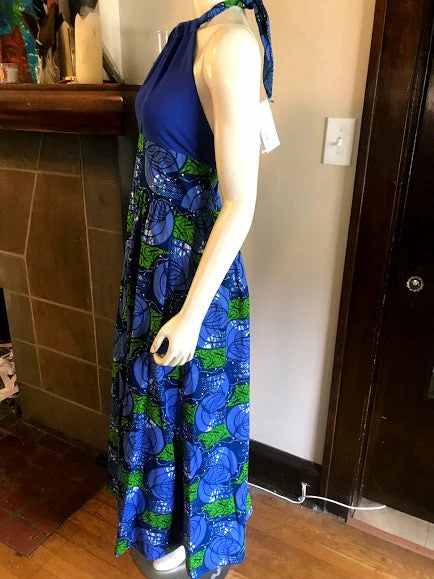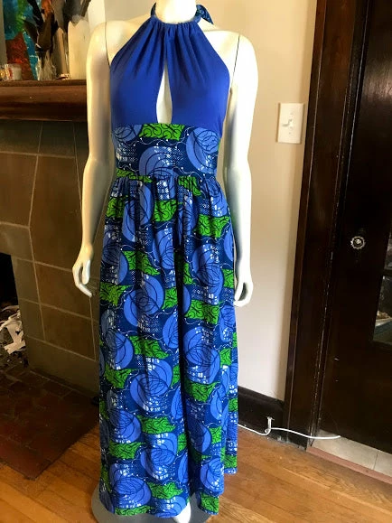 Halter maxi dress, in blue and green African print. Open back and tie neck, waist band and full skirt with side slit. Made from direct sourced GTP African wax cotton fabric and knit.