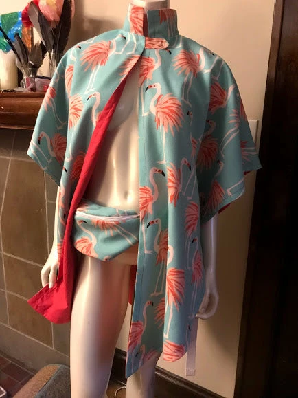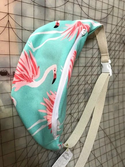 Turquoise and pink flamingo print hip bag with adjustable parachute belt buckle. This fanny pack is made from water resistant canvas, and fully lined in bright pink with zipper closure. Matching cape sold separately.