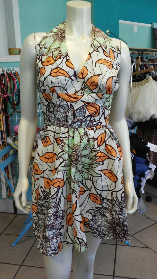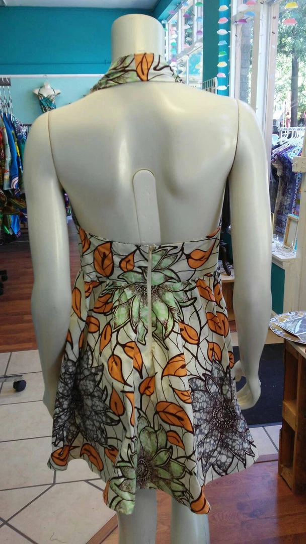Ultra flattering and a flirty fit, this ankara sundress is as fashionable as it is comfortable. Halter bodice slips around the neck, and has a beautiful open back, you’ll make a statement entering and exiting a room! Side pockets, back zipper. Made from premium Vlisco African wax block cotton. Machine wash cold