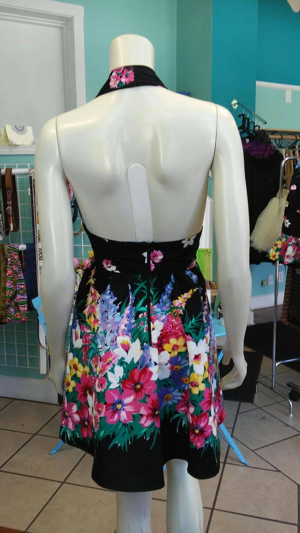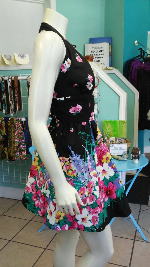 Ultra flattering and a flirty fit, this floral sundress is as fashionable as it is comfortable. Halter bodice slips around the neck, and has a beautiful open back, you’ll make a statement entering and exiting a room! Side pockets, back zipper. Made from beautiful vintage cotton with a floral panel. Machine wash cold.