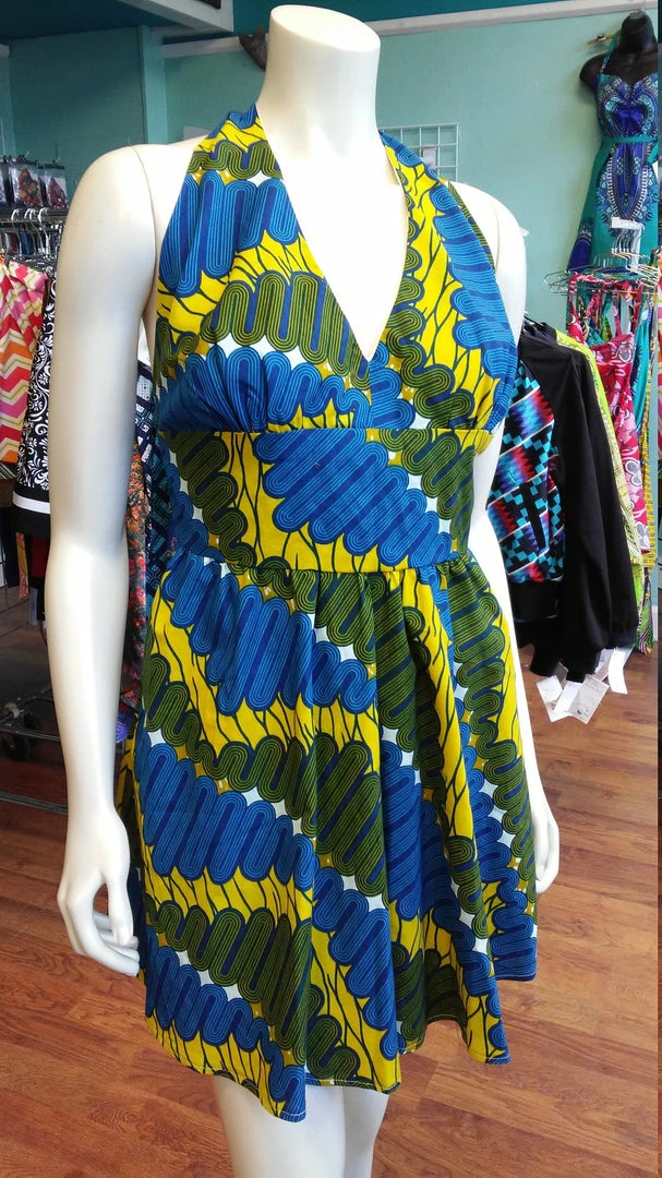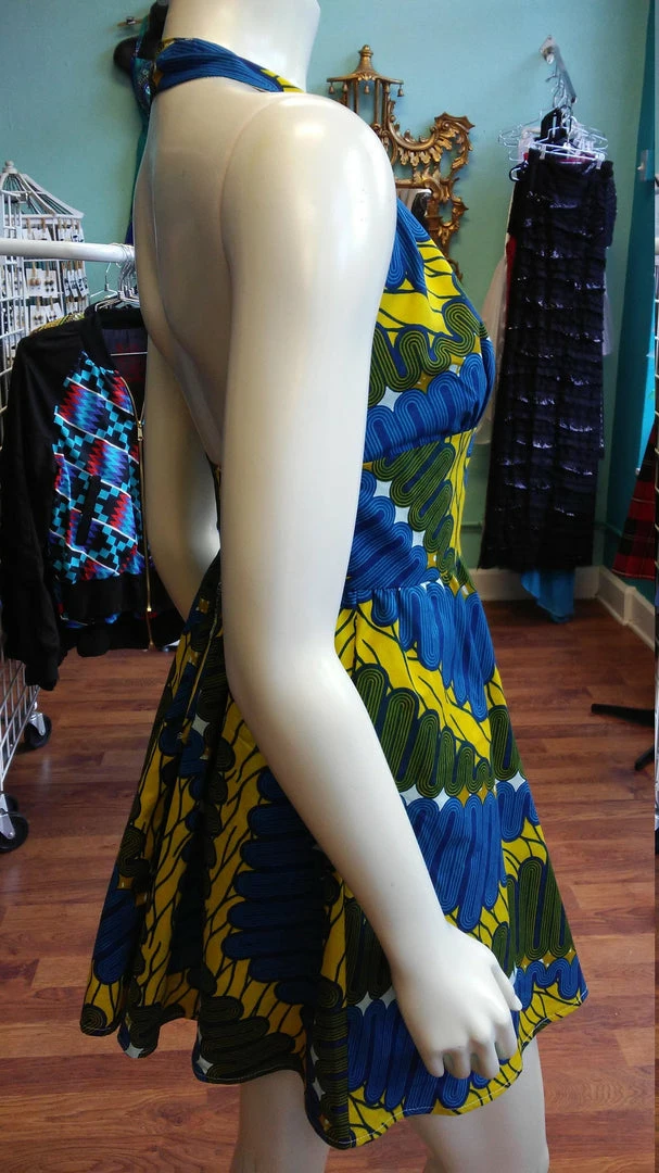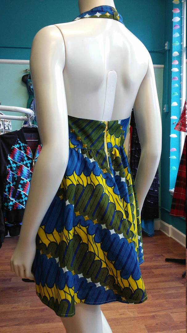 Ultra flattering and a flirty fit, this sundress is as fashionable as it is comfortable. Halter bodice slips around the neck, and has a beautiful open back, you’ll make a statement entering and exiting a room! Side pockets, back zipper. Made from bright wax block cotton. The fabric is from GTP NuStyle, a Ghanaian owned fabric company, and sourced in Accra, Ghana. Part of the Tidal Cool Vivid! Collection created for Accra Fashion Week. All clothing handmade in Cleveland, Ohio.