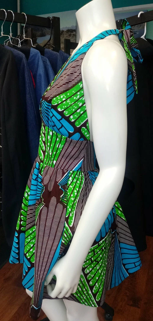 Ultra flattering and a flirty fit, this sundress is as fashionable as it is comfortable. Halter bodice ties around the neck, and has a beautiful open back, you’ll make a statement entering and exiting a room! Side pockets, back zipper. Made from bright wax block cotton. The fabric is from GTP NuStyle, a Ghanaian owned fabric company, and sourced in Accra, Ghana. Part of the Tidal Cool Vivid! Collection created for Accra Fashion Week
