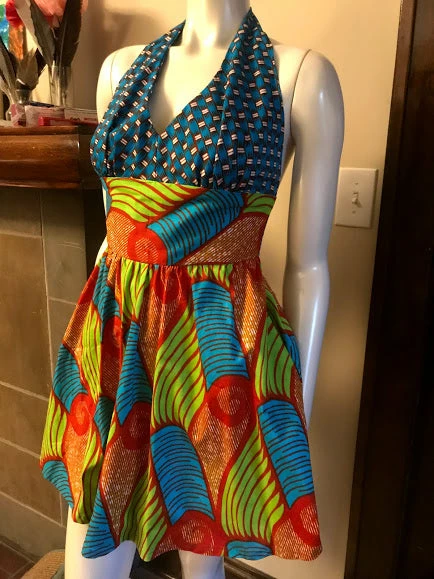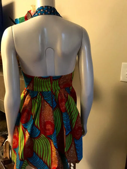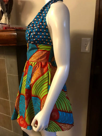 Ultra flattering and a flirty fit, this bold African print sundress is as fashionable as it is comfortable. Halter bodice ties around the neck, and has a beautiful open back, you’ll make a statement entering and exiting a room! Side pockets, back zipper. Made from bright blue, lime green and red wax block cotton. The fabric is from GTP NuStyle, a Ghanaian owned fabric company, and sourced in Accra, Ghana. All clothing handmade in Cleveland, Ohio.