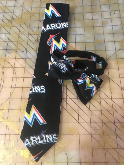 Florida Marlins MLB necktie in bow tie, skinny tie, or standard tie styles, and kids or adult sizes. Adult Florida Marlins bow tie is self-tie, sized to 16.5″, custom length available at no charge. Kids Florida Marlins bow tie comes pre-tied, and has back elastic to allow it to slip over the head. Please see chart below for full necktie and bow tie sizing for children and adults.