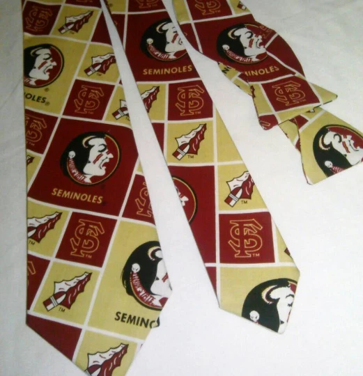 Florida State Seminoles necktie in bow tie, skinny tie, or standard tie styles, and kids or adult sizes. Adult Florida State Seminoles bow tie is self-tie, sized to 16.5″, custom length available at no charge. Kids bow tie comes pre-tied, and has back elastic to allow it to slip over the head. Please see chart below for full necktie and bow tie sizing for children and adults.
