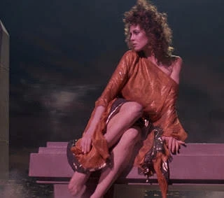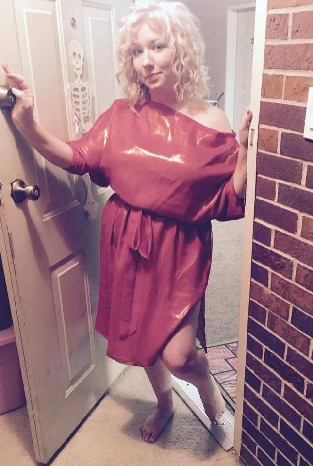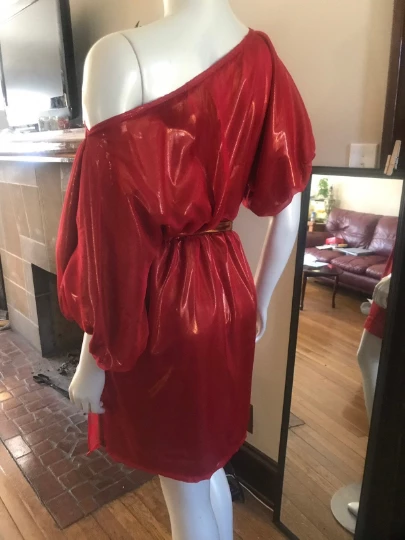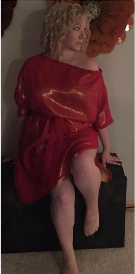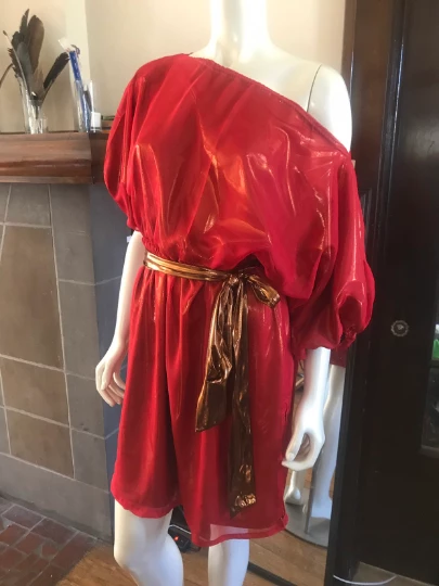 Ghostbusters Zuul dress. Made to order, please provide general dress size and height with order. Dress is 2 layered, liquid gold covered with red chiffon. Dress is loose fitting, off shoulder, and has small side slit. Dress includes gold sash to tie at waist.