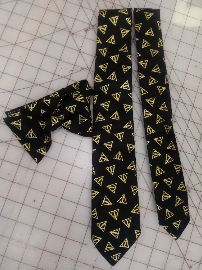Harry Potter and the Deathly Hallows necktie in bow tie, skinny tie, or standard tie styles, and kids or adult sizes. Adult Harry Potter bow tie is self-tie, sized to 16.5″, custom length available at no charge. Kids bow tie comes pre-tied, and has back elastic to allow it to slip over the head. Please see chart below for full necktie and bow tie sizing for children and adults.