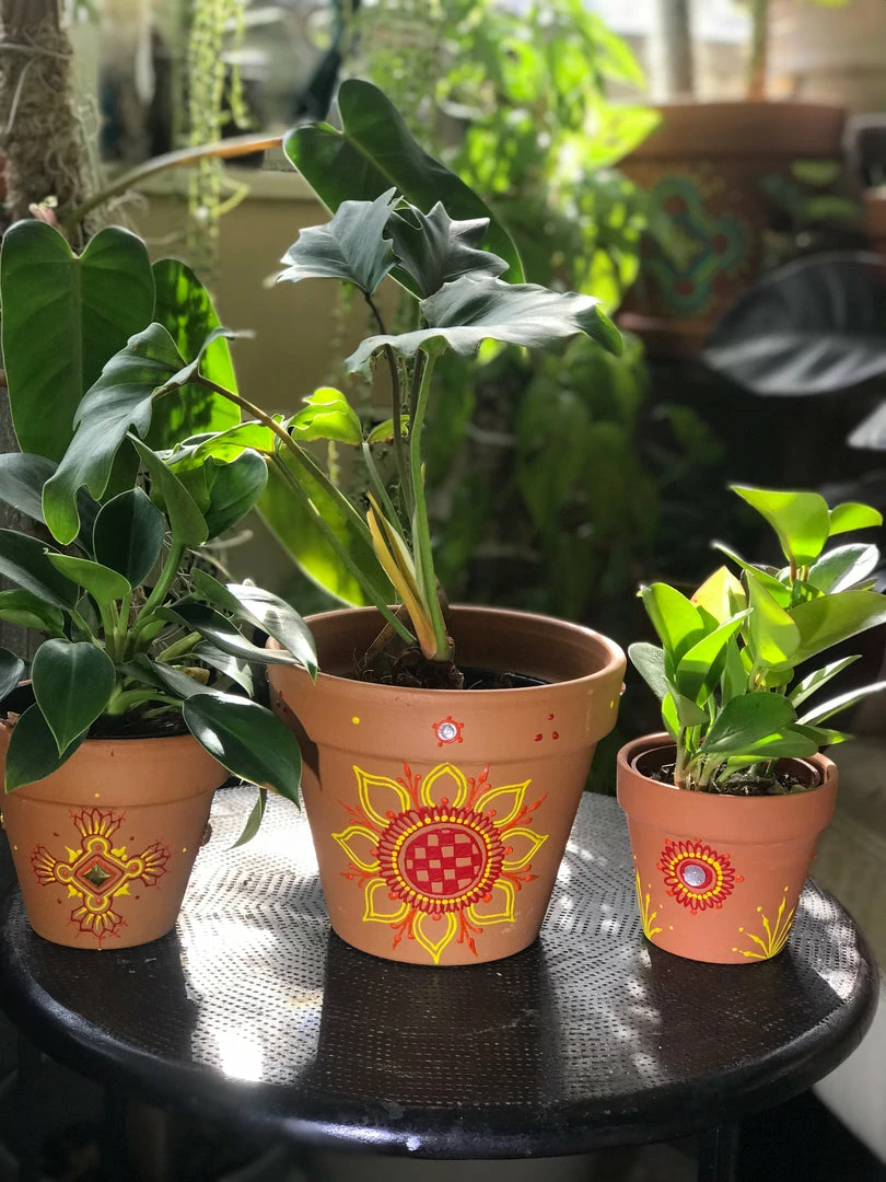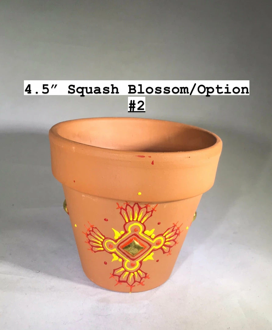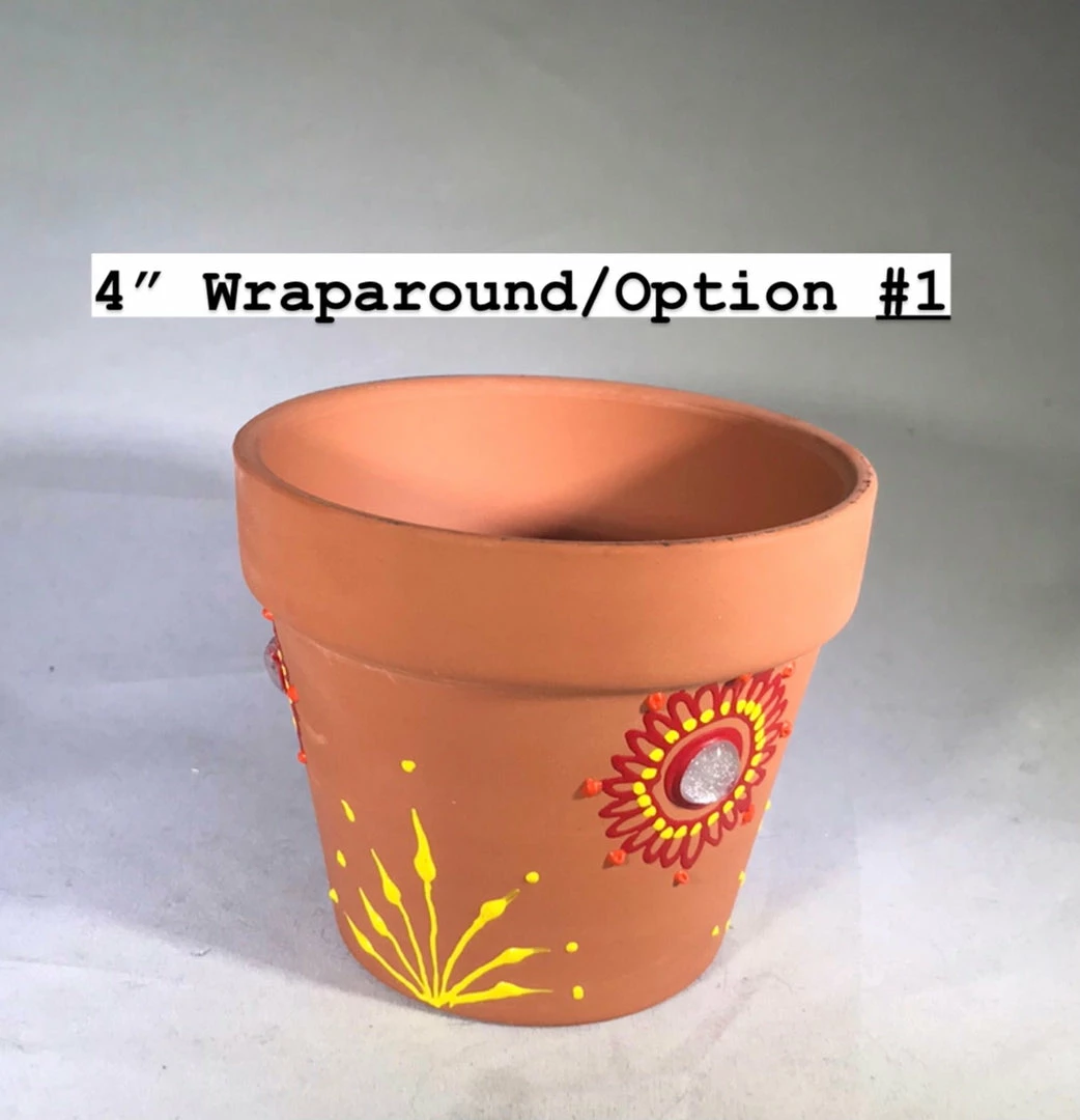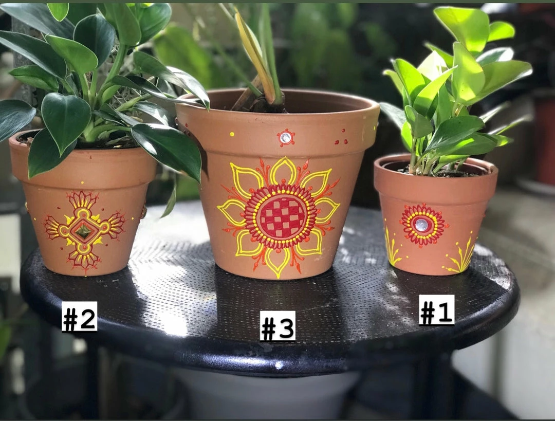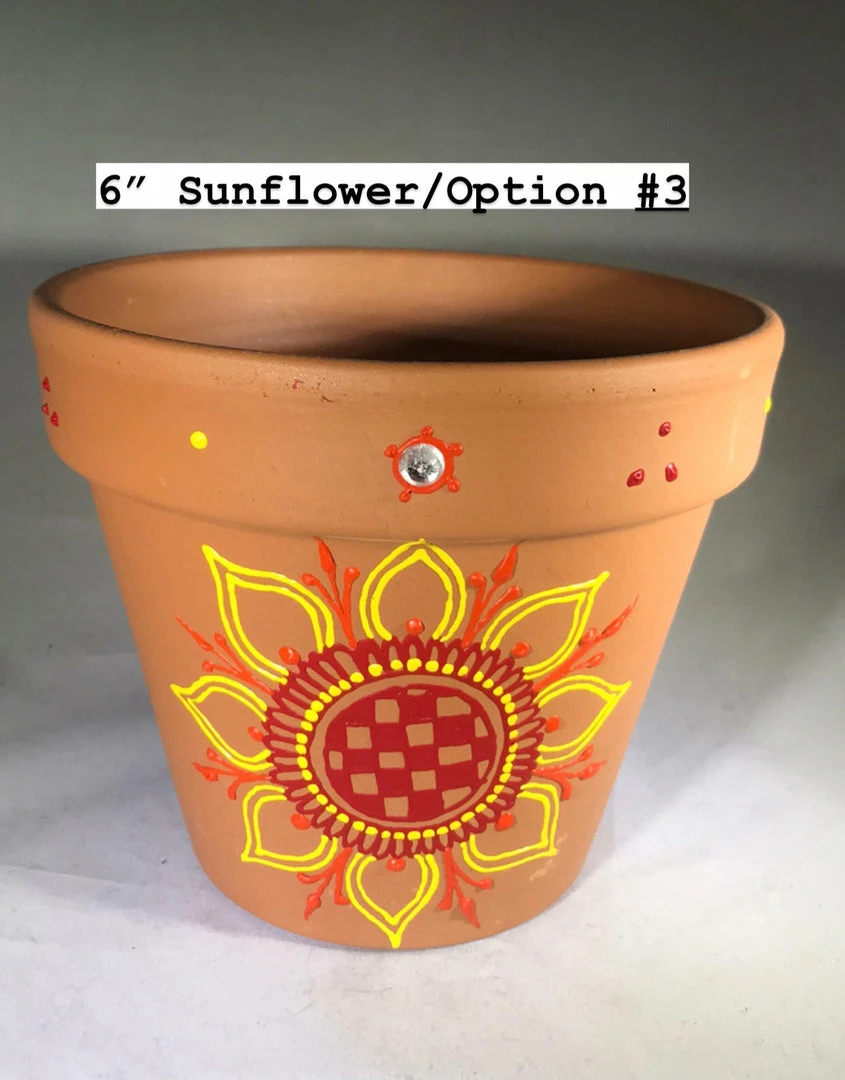 Hand painted terra cotta clay pots, with original henna designs applied in sunny red, orange, and yellow acrylic paint. Pots are heat sealed and suitable for indoor or outdoor use. A beautiful was to accent your plants, and a wonderful gift! Choose from 4″, 4.5″, and 6″ clay pots.