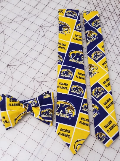 Kent State Necktie in bow tie, skinny tie, or standard tie styles, and kids or adult sizes. Adult Kent State bow tie is self-tie, sized to 16.5″, custom length available at no charge. Kids’ bow tie comes pre-tied, and has back elastic to allow it to slip over the head. Please see chart below for full necktie and bow tie sizing for children and adults.