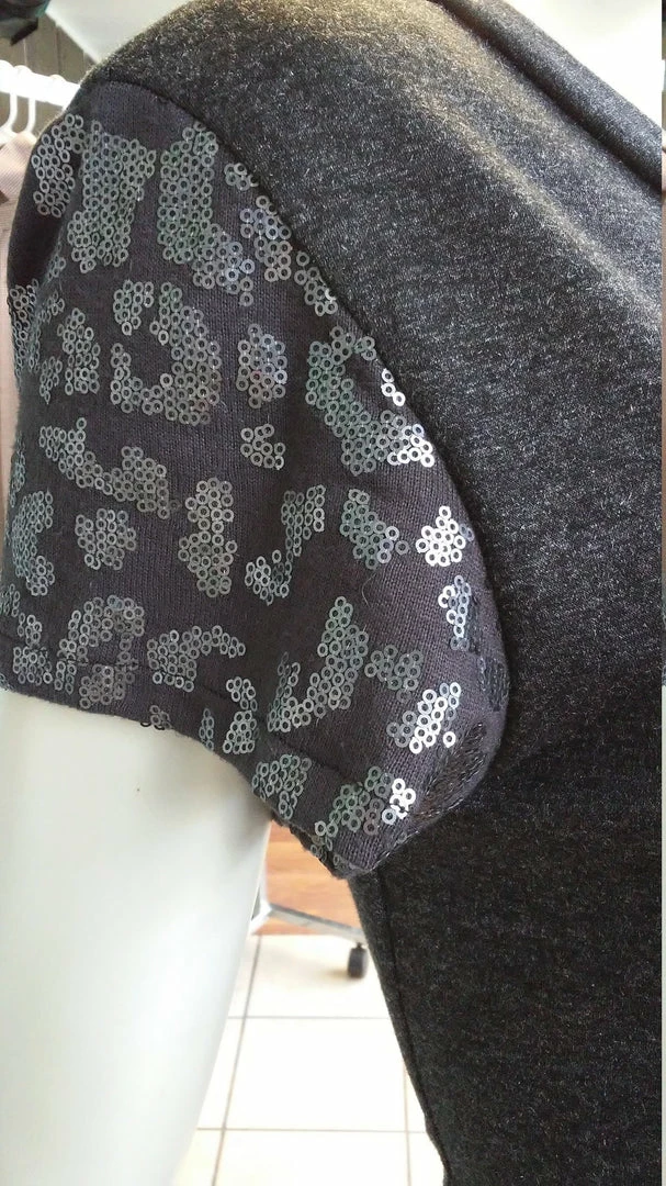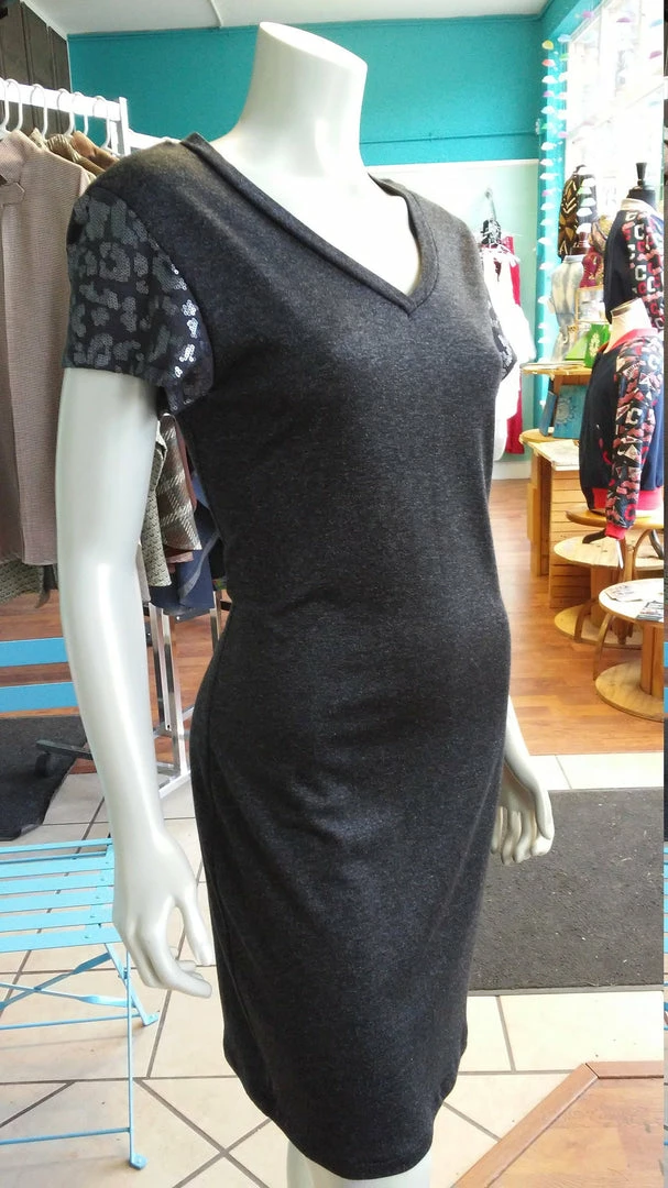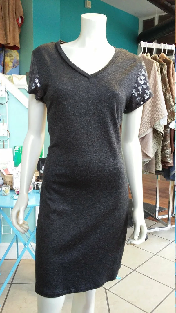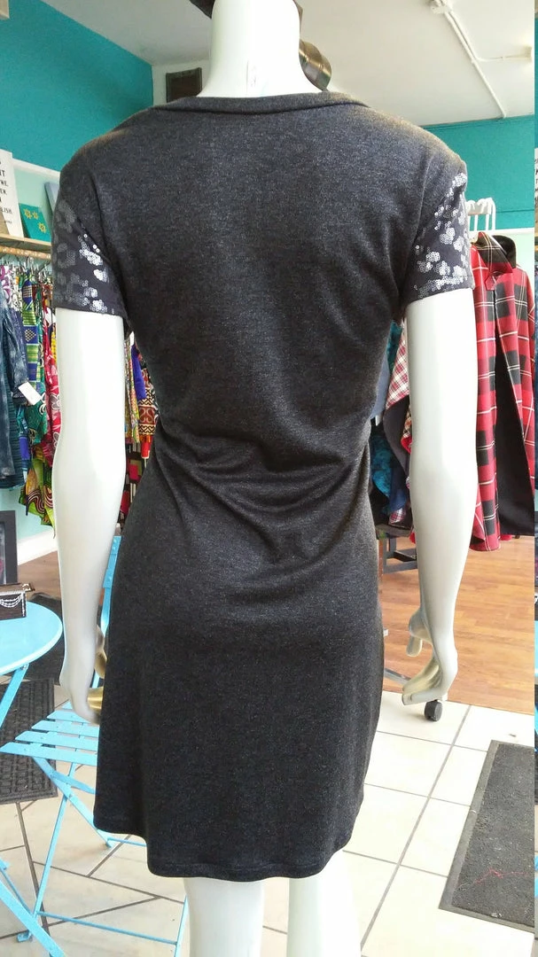 Super comfortable, lightweight knit short sleeve vneck dress. Sequins on sleeves for added style. Falls just above the knee. Wear with leggings, a belt, boots, etc. Versatile and comfortable. All clothing handmade in Cleveland, Ohio.