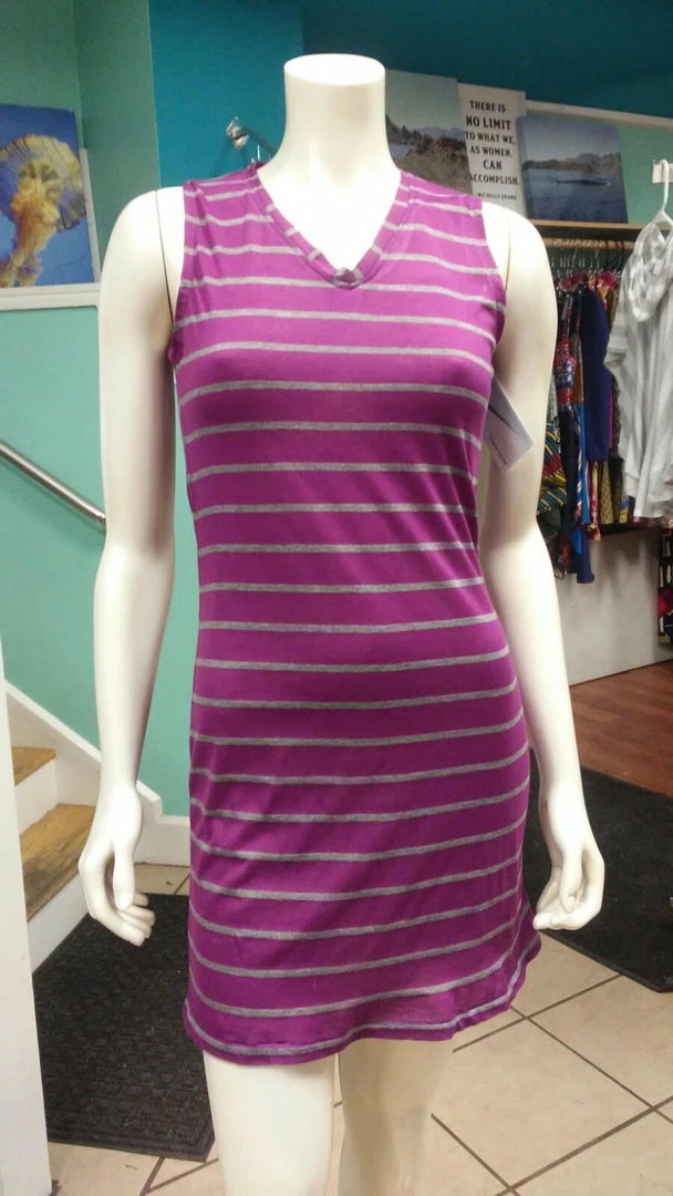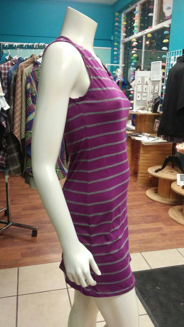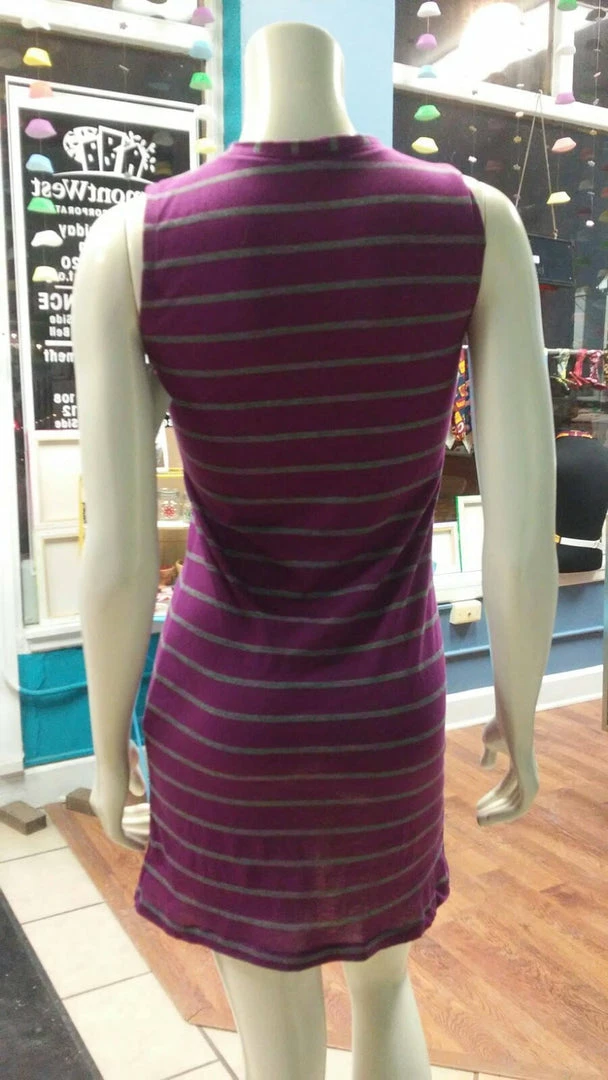 Super comfortable, lightweight knit sleeveless dress in casual purple and grey striped stretch. Easy care, machine wash and dry. Wear with leggings, a belt, boots, etc. Versatile and comfortable. All clothing handmade in Cleveland, Ohio.