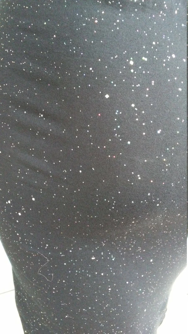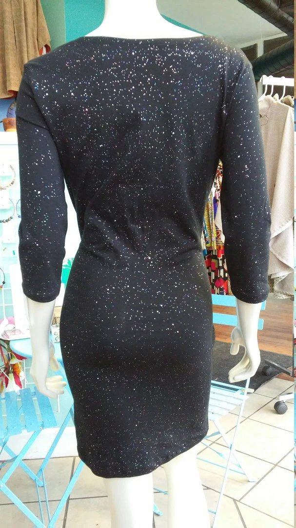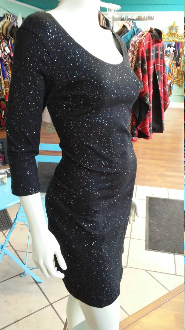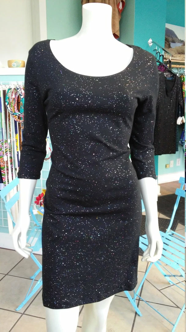Super comfortable, lightweight three-quarter sparkle sleeve dress. Easy care, machine wash and dry. Wear with leggings, a belt, boots, etc. Versatile and comfortable.