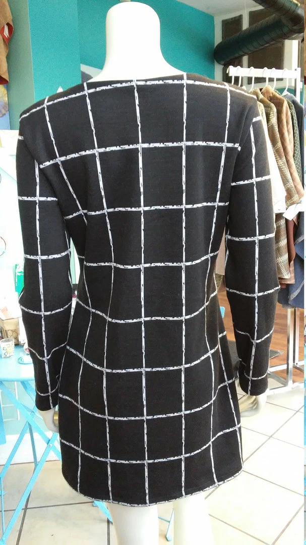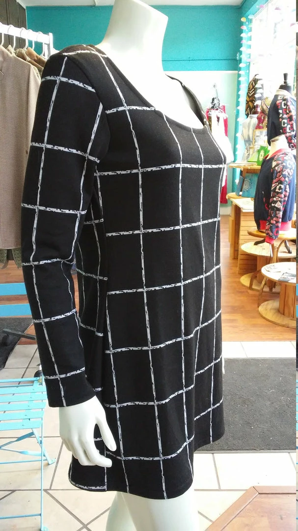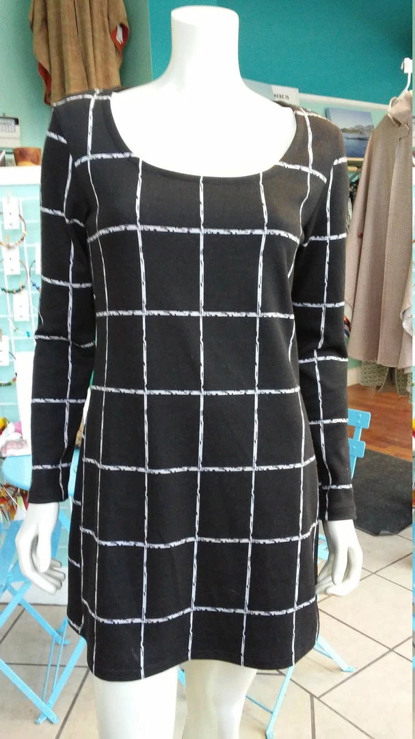 Super comfortable knit, long sleeve scoop neck dress in black and white. Easy care, machine wash and dry. Wear with leggings, a belt, boots, etc. Versatile and comfortable. All clothing handmade in Cleveland, Ohio.